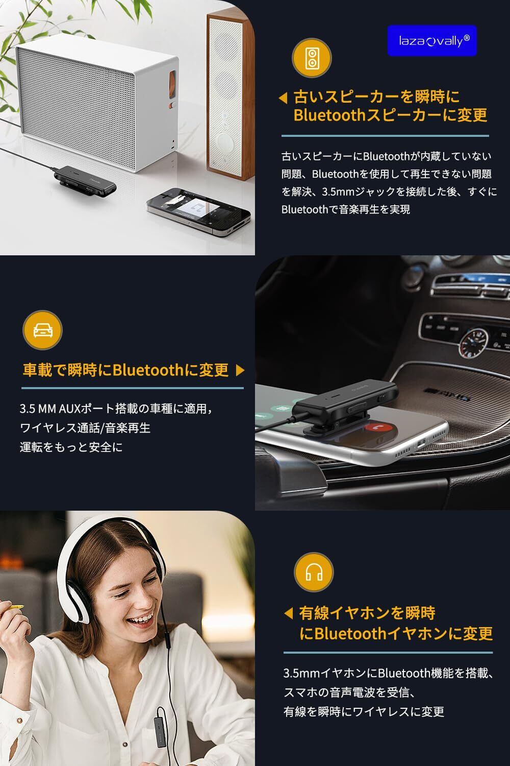 【Bluetooth非対応機器を簡単にワイヤレス化 】Bluetooth機能のないカーオーディオ、スピーカーやコンポ等とスマホやタブレットをワイヤレス接続可能、汎用3.5mmプラグ付き、車用、家庭用、様々なシーンでスピーカー、イヤホン、AUX入力を備えた車、家庭用ステレオなどに対応します。
