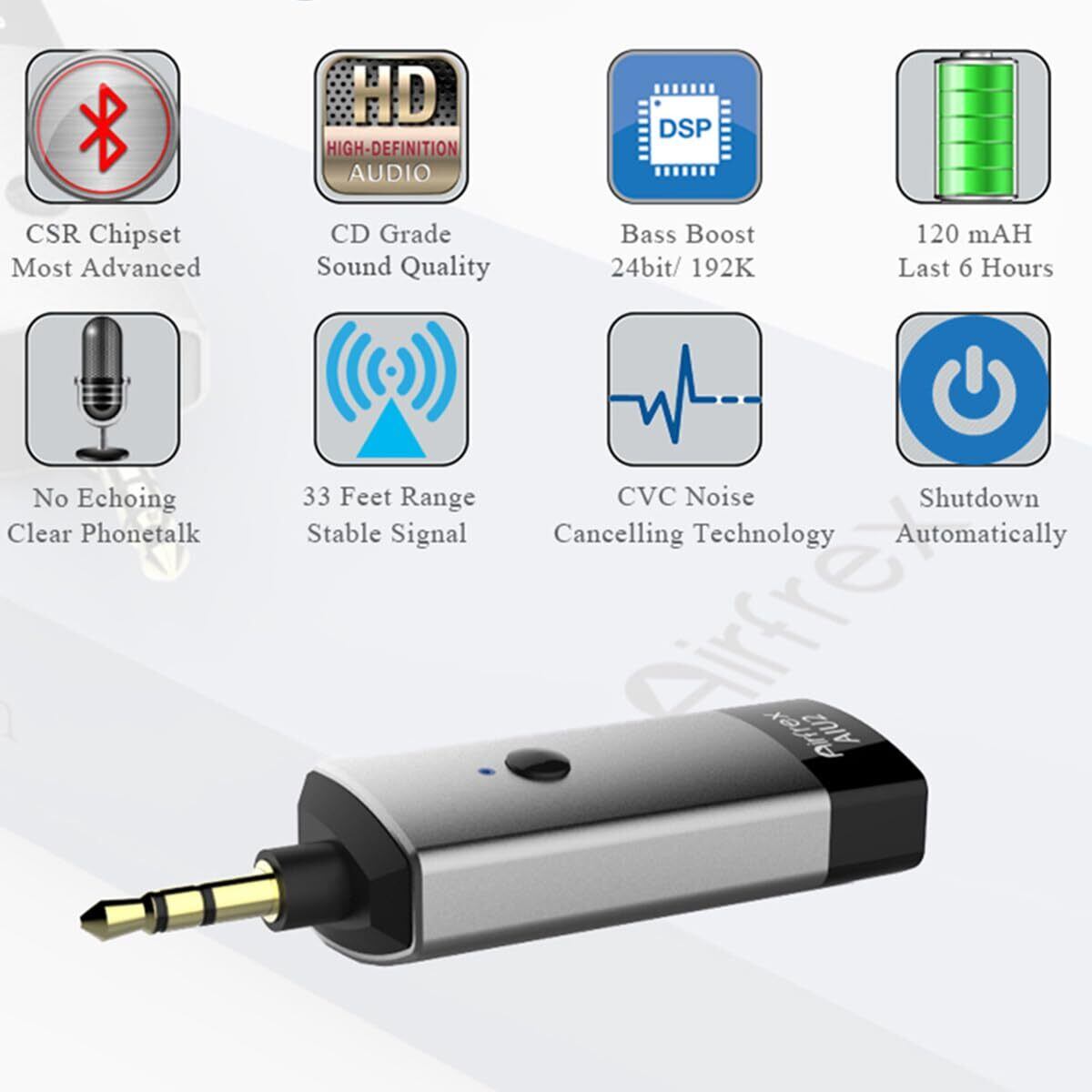 Bluetoothオーディオレシーバーアダプタ, Airfrex 超小型ワイヤレスBluetooth オーディオ受信機 &ミニ3.5 mm AUX無線オーディオアダプタ 内蔵マイク ステレオ 低雑音 車載/家庭オーディオ、イヤホン、スピーカー用(ヘッドホンアンプ機能付き)