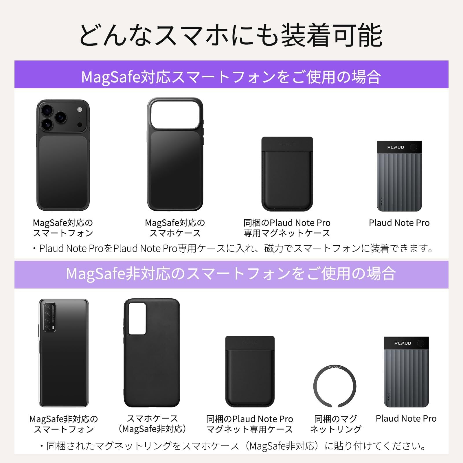 【スマホに簡単装着】強力磁力のマグネット式で、MagSafe対応iPhoneなら、背面に一瞬で装着できます。MagSafe非対応のスマートフォンの場合でも、同梱のマグネットリングをケースに貼ることにより、Note Proをスマートフォンにしっかり固定できます。