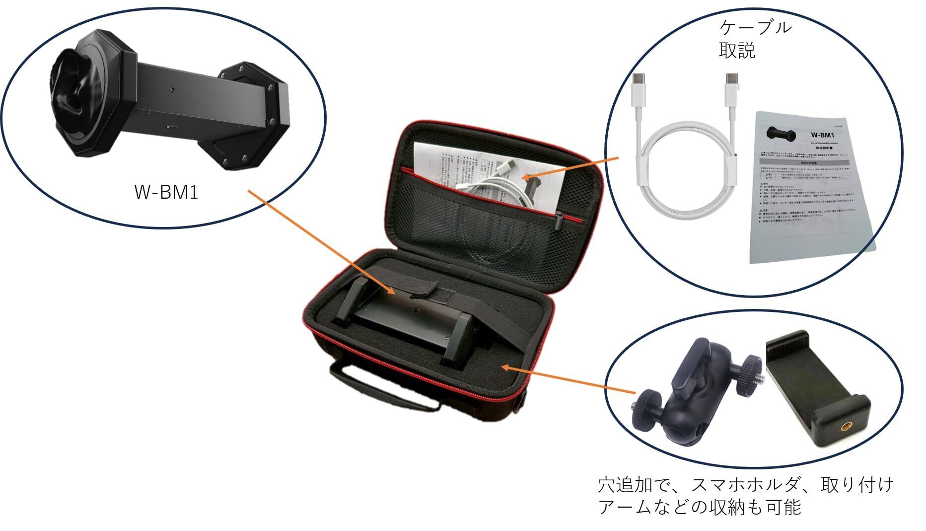 バイノーラルマイク WHISMR W-BM1を安全かつスタイリッシュに保管するためのセミハードタイプの収納ケースです。ポリエステルEVA素材で作られており、内装にはバイノーラルマイクW-BM1に合わせて予めカットされたグリッド分割されたスポンジフォームが装備されています。DIYによる追加工により、スマホホルダー、アームの収納場所を追加する事も可能です。また、上部の収納ポケットにはミニ三脚の収納も可能です。