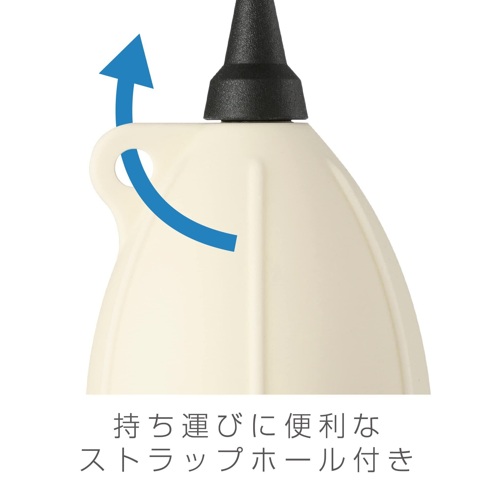 テーブルの上などに立てて置きやすい幅広のスタンド形状。ノズルの付け根部分には持ち運びに便利なストラップホールつき。