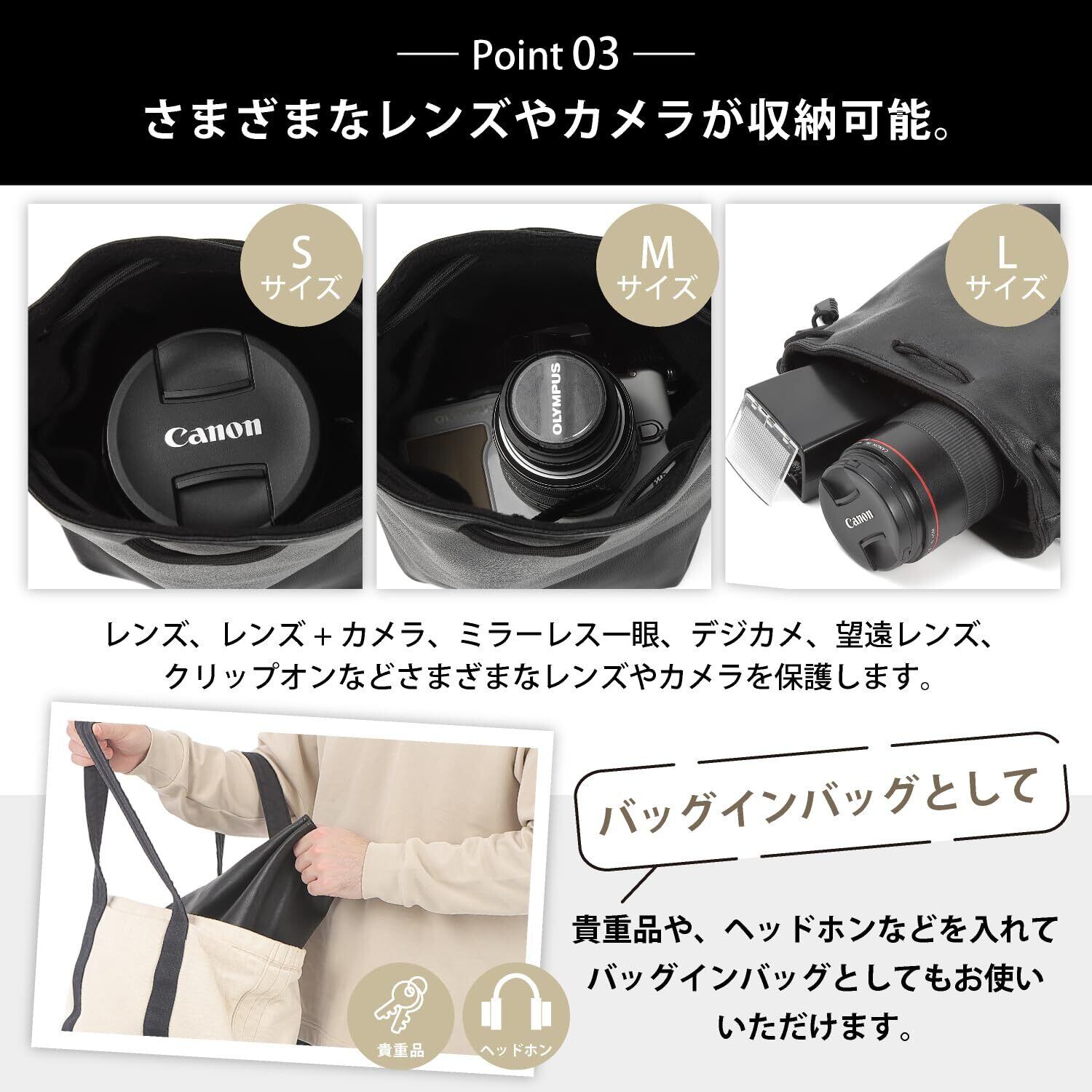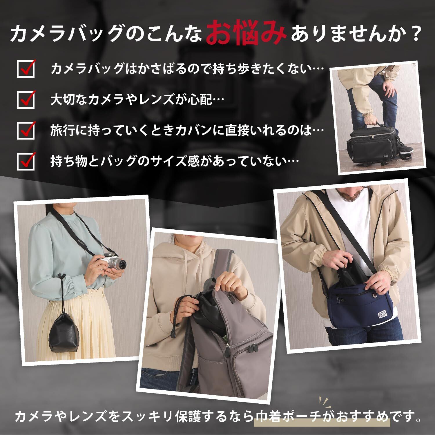 カッコ良く上質感漂うPU加工されたカメラケース。出し入れしやすい巾着型で大人カジュアルに合わせやすく、普段使いもばっちりなショルダーバッグ。Sサイズでも小型ミラーレスカメラがすっぽり入ります。