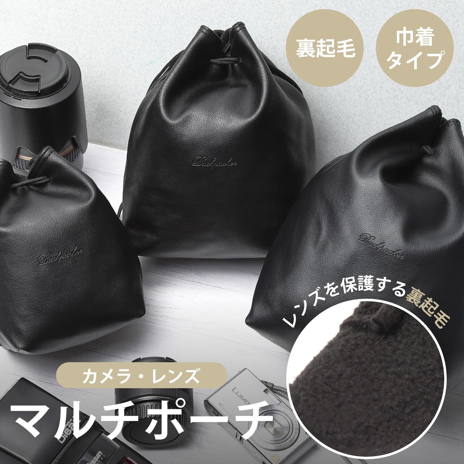 カメラバッグ レンズケース 軽量 巾着型 ミニサイズ 裏地 フリース (ブラック, M)