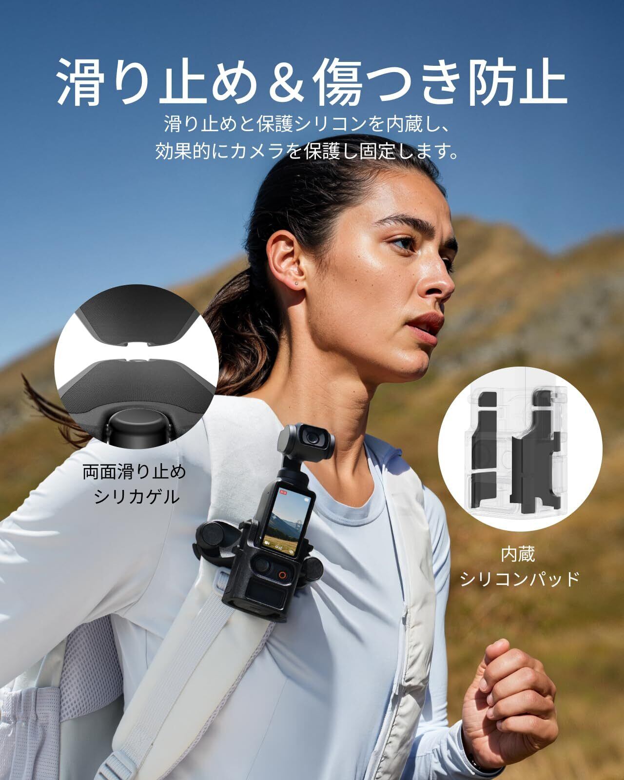 【滑り止めのスクラッチ防止】 クリップの両面にシリカゲルの滑り止めパターンがあり、本体フレームの両側にも滑り止めシリカゲルパッドが内蔵されており、カメラをしっかり固定することができ、リュックサックとカメラの摩耗を効果的に防止することができる。