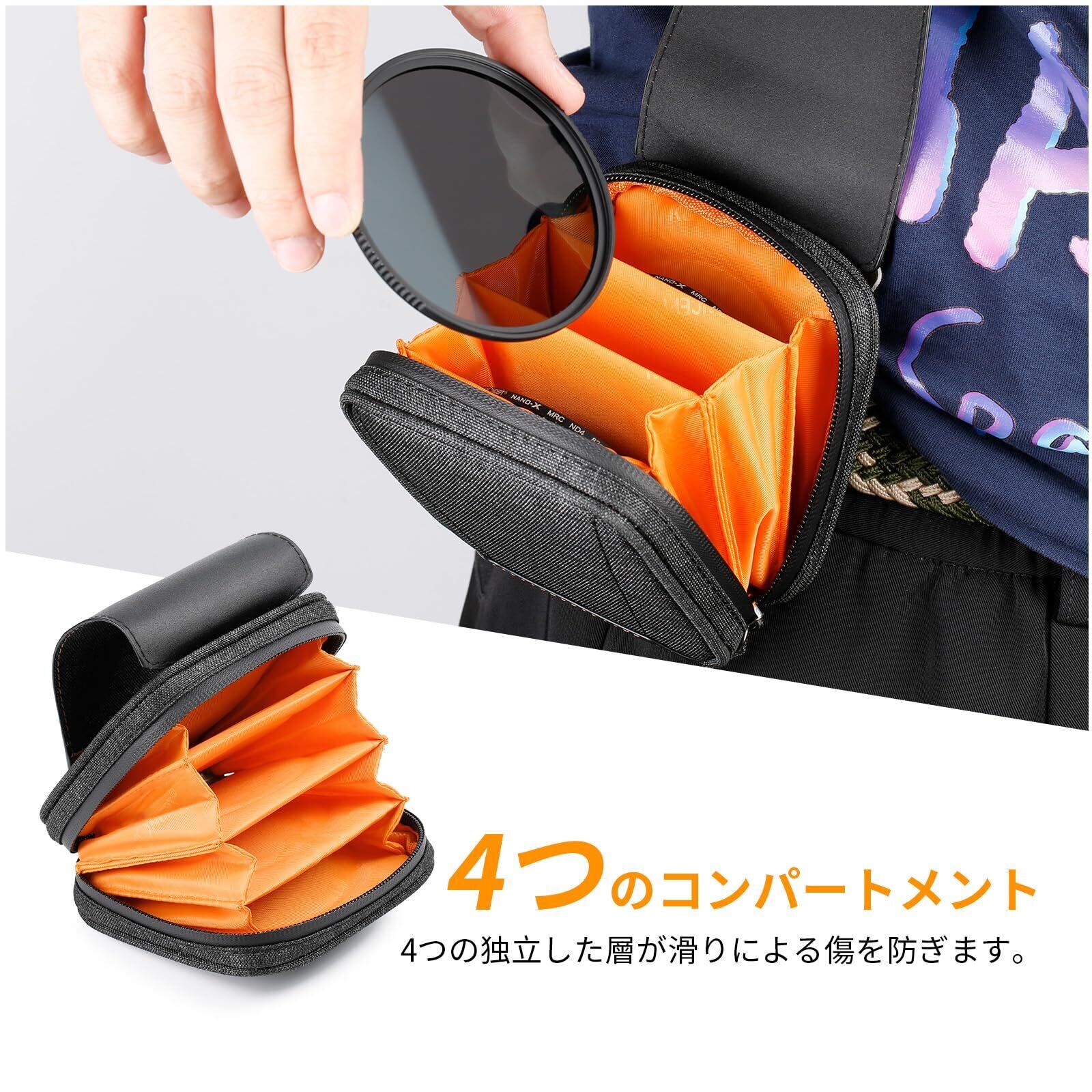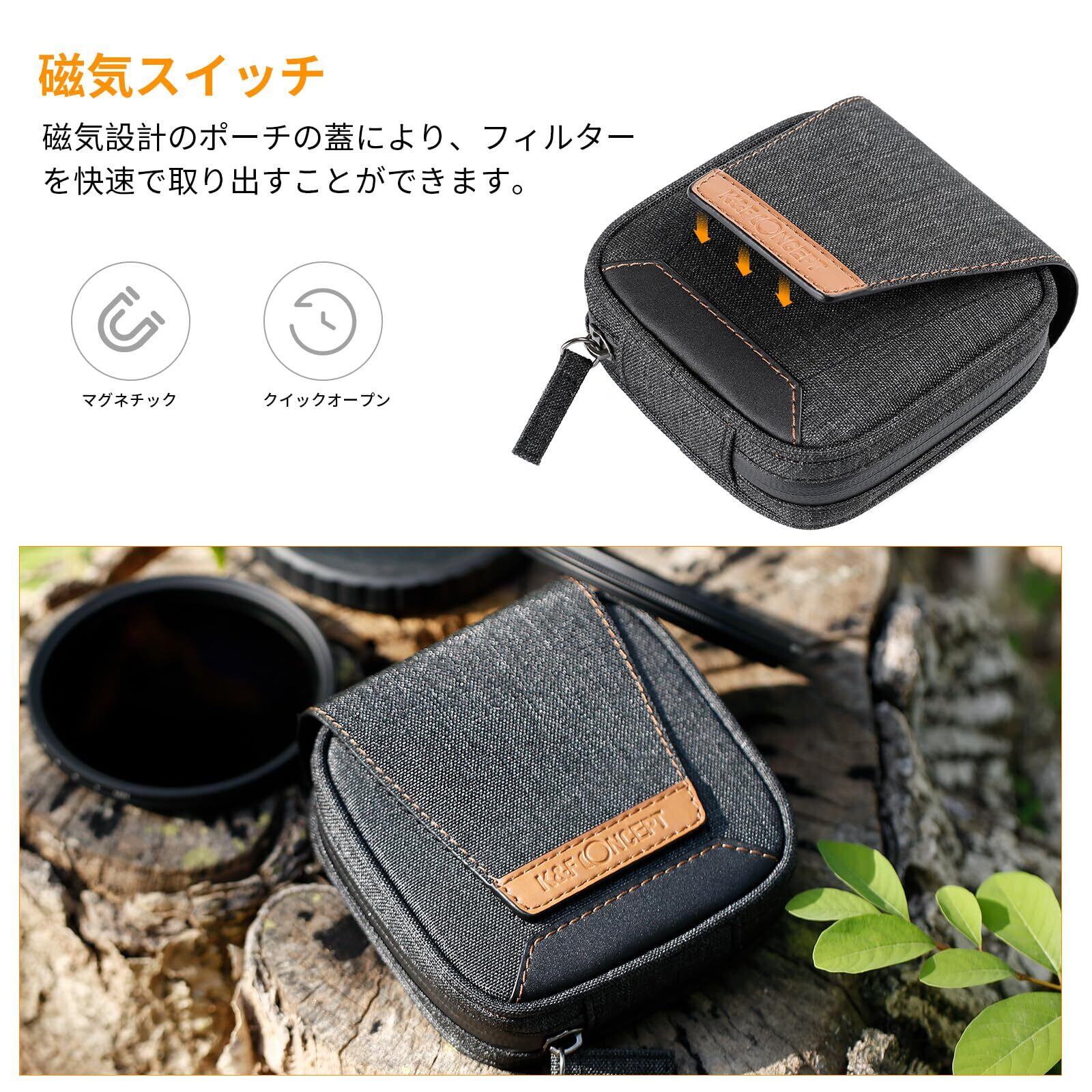 破れにくい撥水性の高品質生地、頑丈な防水ジッパー、磁気あるカバーによる二重保護、内側の耐衝撃性コットン、柔らかくて大切なフィルターを安全に保管することができます。