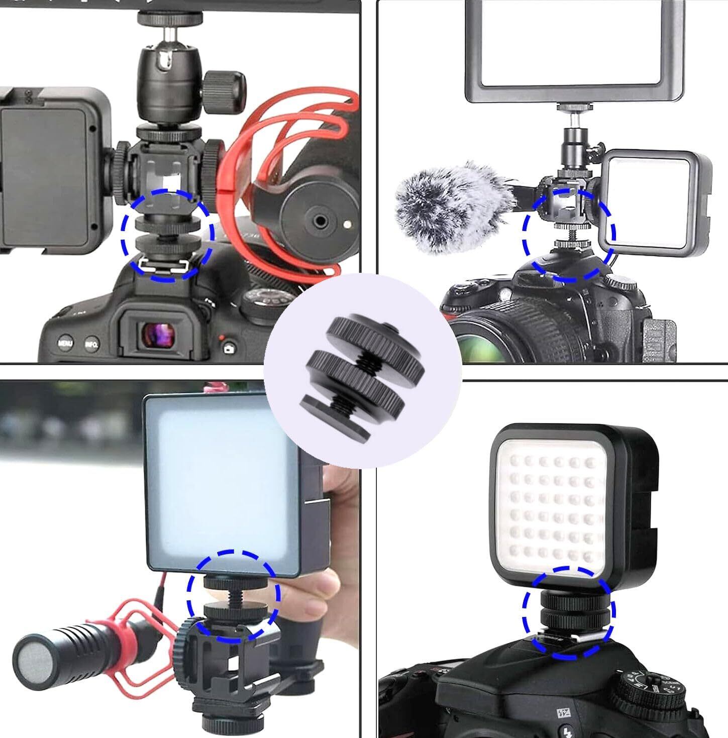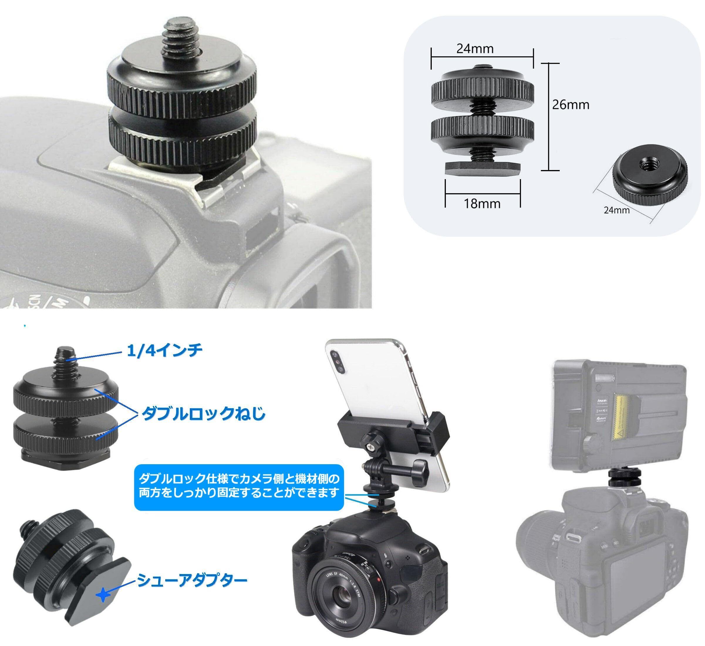 【様々な機材に対応】一眼レフ・ミラーレス カメラのホットシューや拡張ブラケット、カメラやスマホ用ビデオリグやゲージ、ライトスタンドのシューアダプタなどに1/4インチ仕様のカメラ・ビデオカメラ、撮影アイテム、延長ロッド、iPhone, Android 機種等のスマートフォン、マイク、LEDライト、音響機器やアイテムをセットして使用が出来ます。シューマウントアダプターとラバー製スペーサー・パッドのセット商品です。