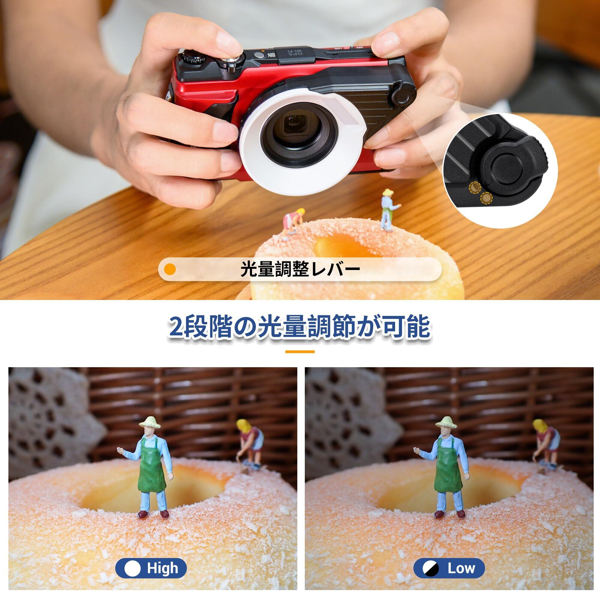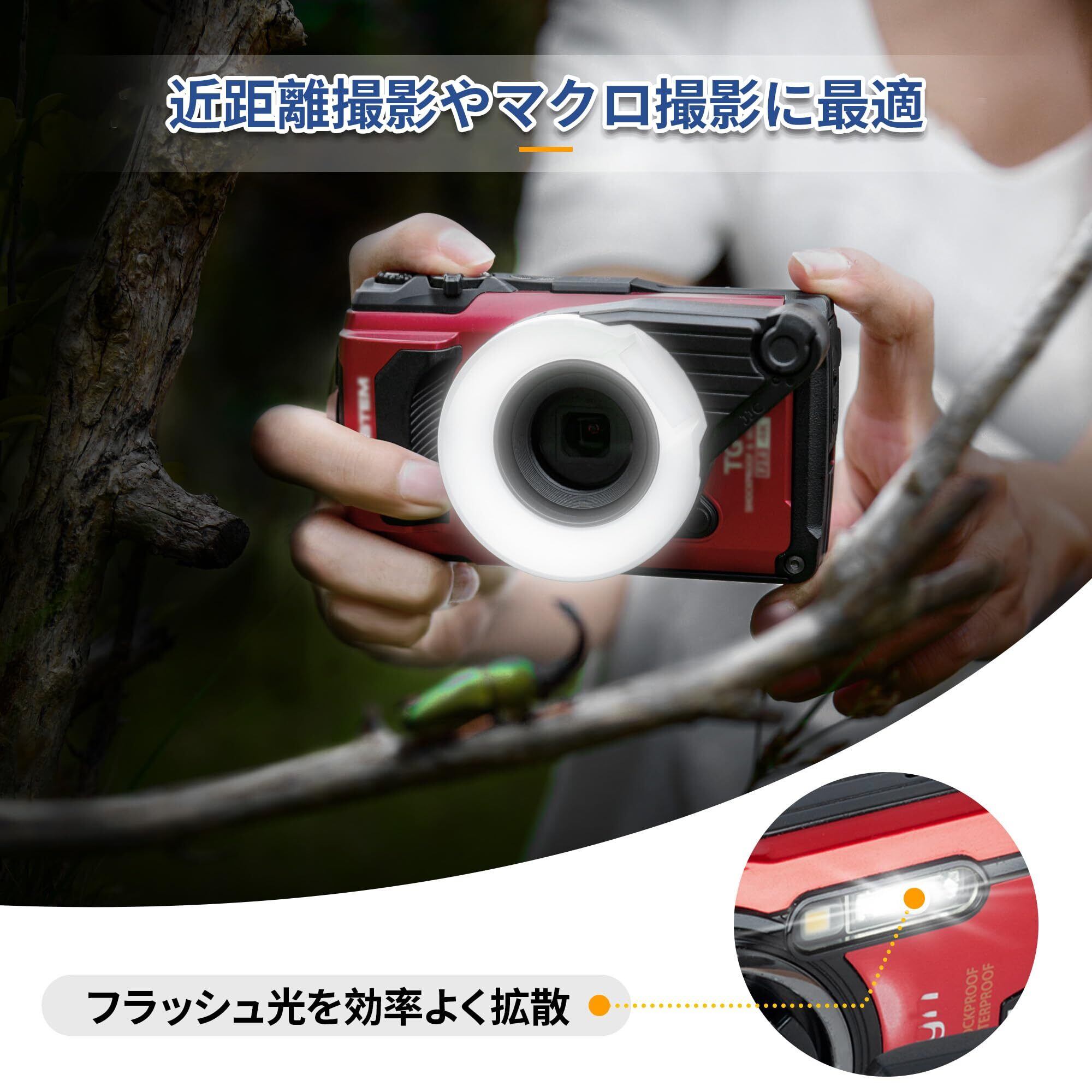 工具なしで簡単に取り付けられます。Olympus Toughシリーズカメラのレンズに直接回転して固定することができ、簡単に影がない画像をキャプチャし、撮影の背景の詳細を表示することができます。