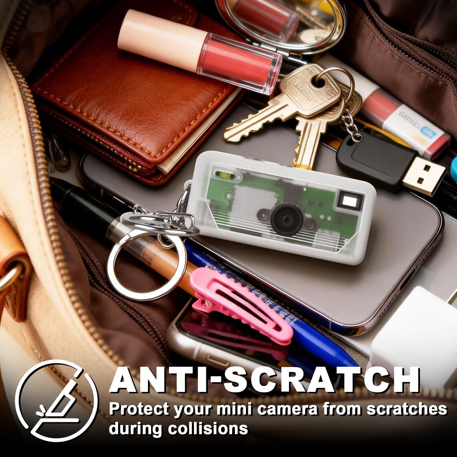 薄型・柔軟素材で使いやすさそのまま: 厚みを極限まで抑えた柔軟シリコンが、キーチェーンカメラのコンパクトで愛らしいフォルムを損ないません。傷防止の保護層を追加しても、携帯性・操作性はそのまま