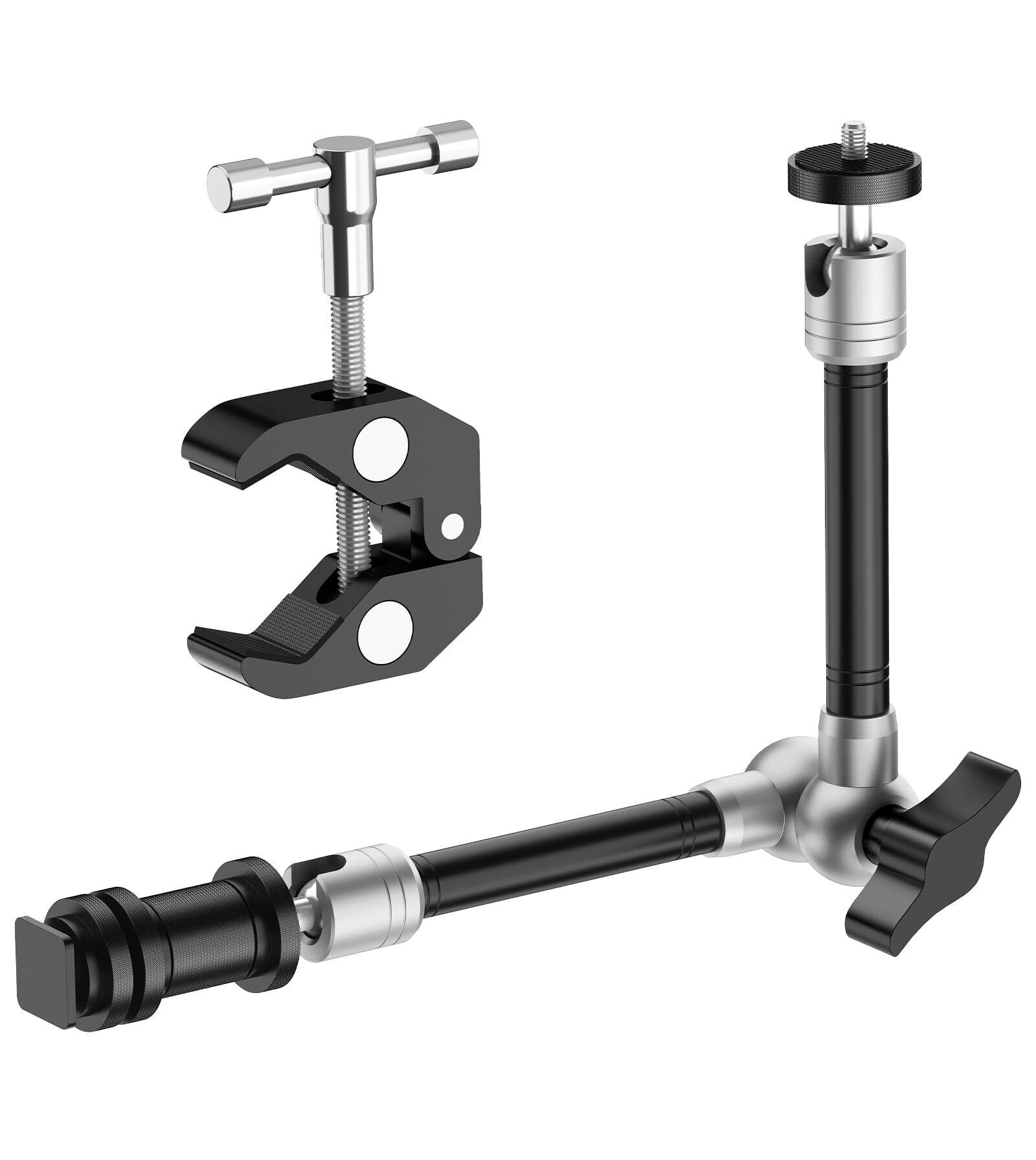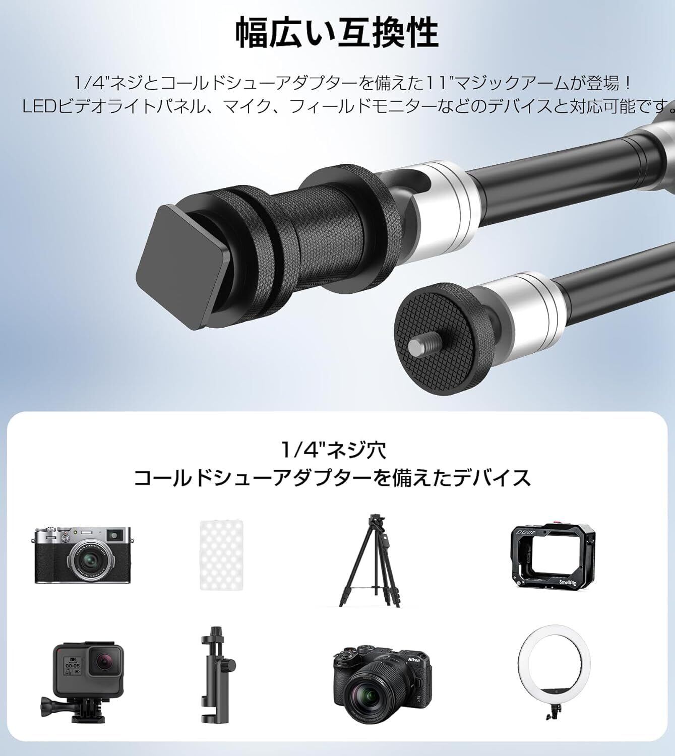 【スーパークランプ付き多関節マジックアーム】:11inch/28cmマジックアームは360°摩擦ギアジョイントで接続された2本の多関節アームを備え、両端には自由雲台1/4”ネジ付き&シューマウント付きで、写真撮影の様々なニーズに応じてカメラ、プロジェクター、LEDモニター、マイク、ストロボなど対応します。「バカ式」操作ノブ、支柱関節を360°自在に制御でき、すべての操作をつまみで調整できます。