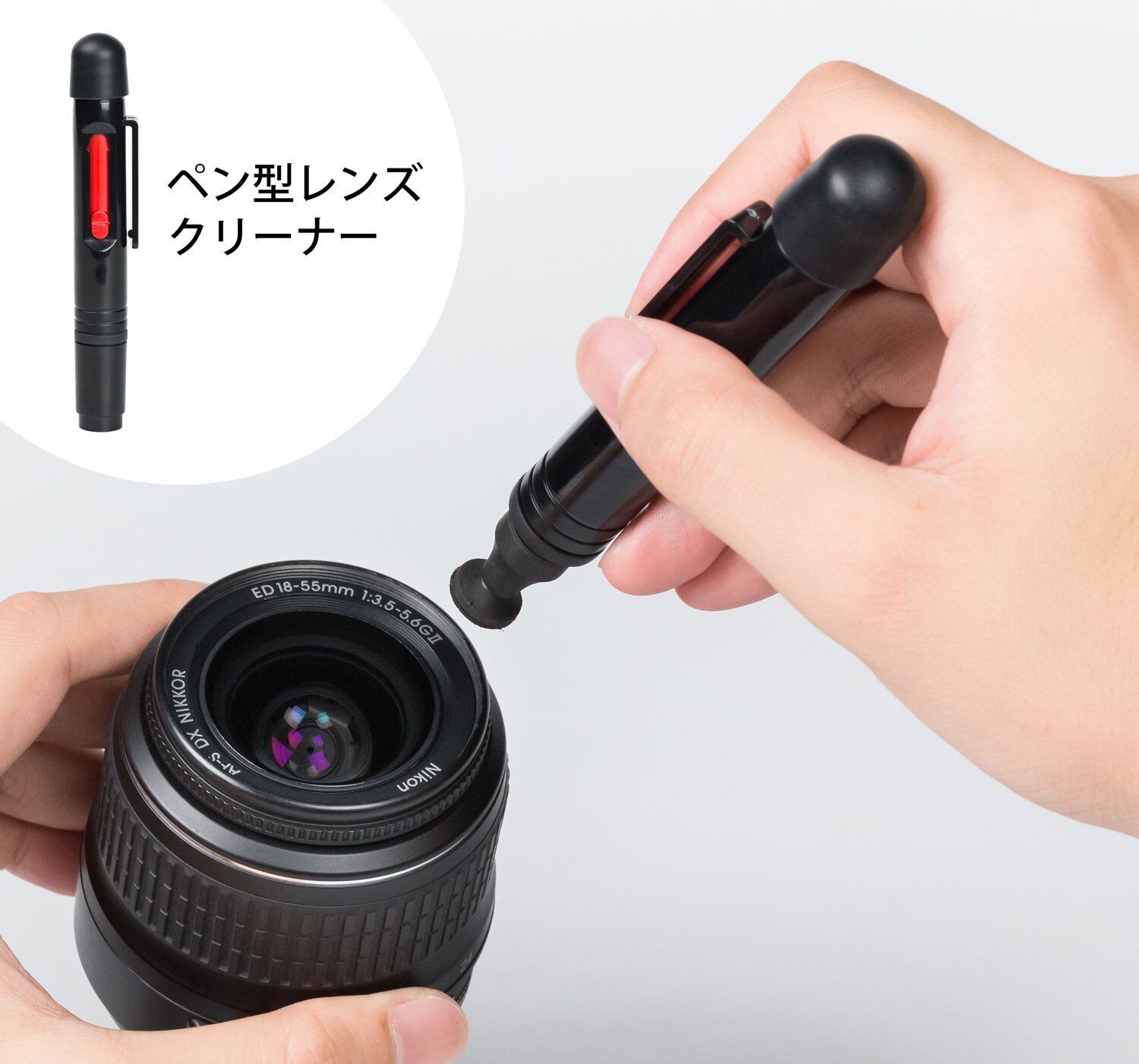 ・ペン型レンズクリーナー…カーボン粉末を配合したパッドを先端に備えたクリーナーです。レンズを円を描くようになぞり、汚れを落とします。