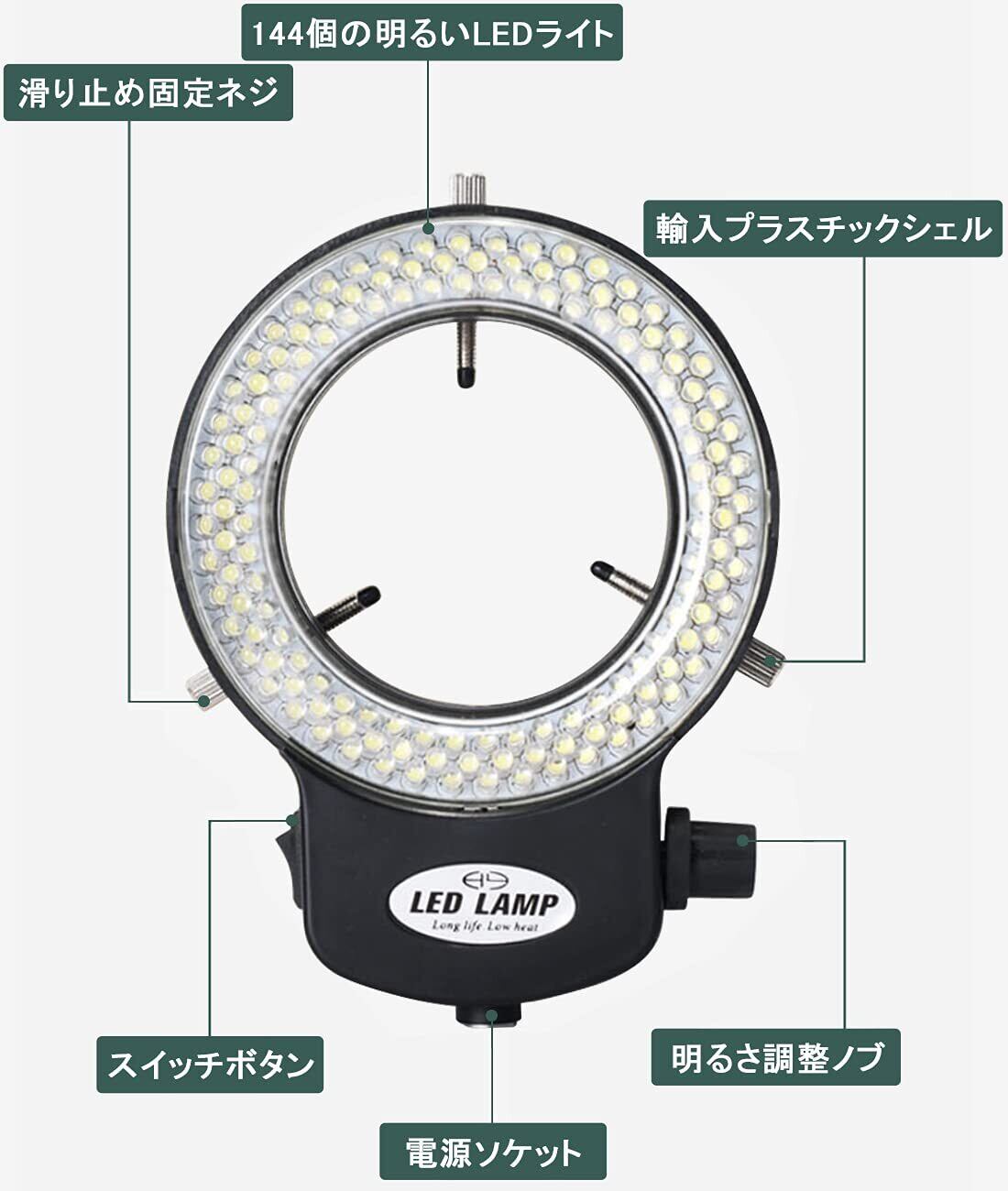【適応場合】144LEDリングライトは、特に立体顕微鏡用に設計されており、さまざまな種類の顕微鏡やカメラに最適です。暗い場所や場所での視聴を捜しながらカメラの焦点を合わせるための光源としても使用できます。