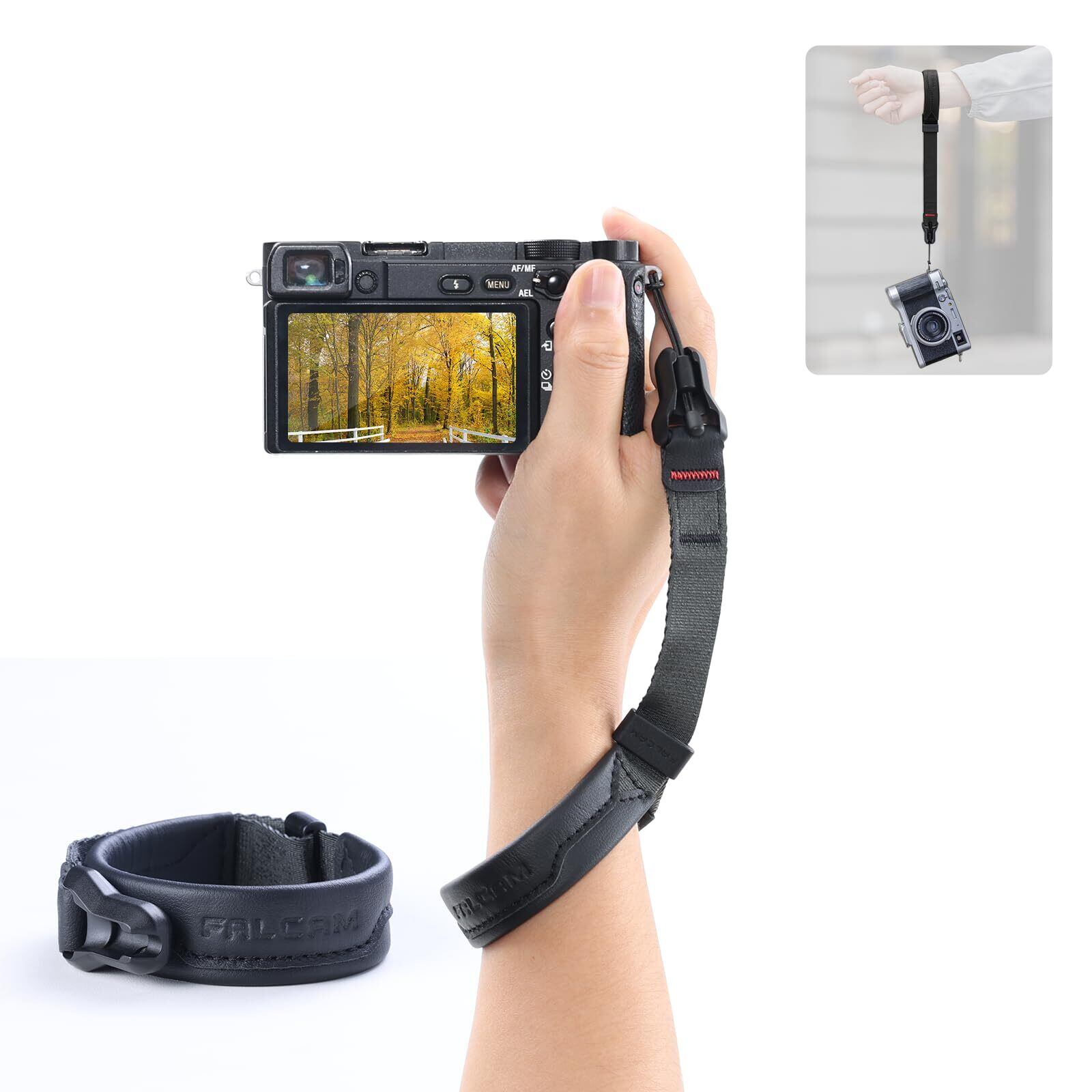 Falcam リストカメラストラップ ハンドストラップ マグネット Maglinkアンカー対応 磁気クイックバックルストラップ 長さ調節可能 安全性 耐久性 耐摩耗性 ナイロン+天然牛革製 Dji用/Sony用/Canon用/Nikon用/Fujifilmカメラ用など用 一眼レフ・ミラーレス用 V2 BLACK