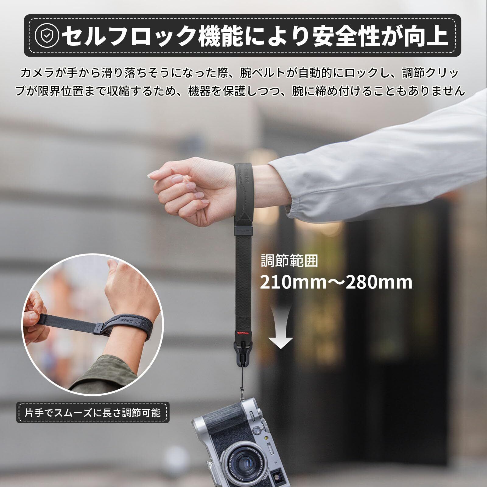 【スムーズに長さ調節】手首に合わせて長さ調節ができるリストストラップです。ストラップの長さを21〜28cmに調整できます。手首に合わせてスライドできるので、カメラをしっかりホールドでき、持ち歩きのときも便利。ストラップにはマグネット式の留め具が内蔵されており、カメラを装着していない時は手首に装着して収納することができます。ブレスレットに早変わりし、揺れやスイングを避け、撮影操作に影響を与えない。