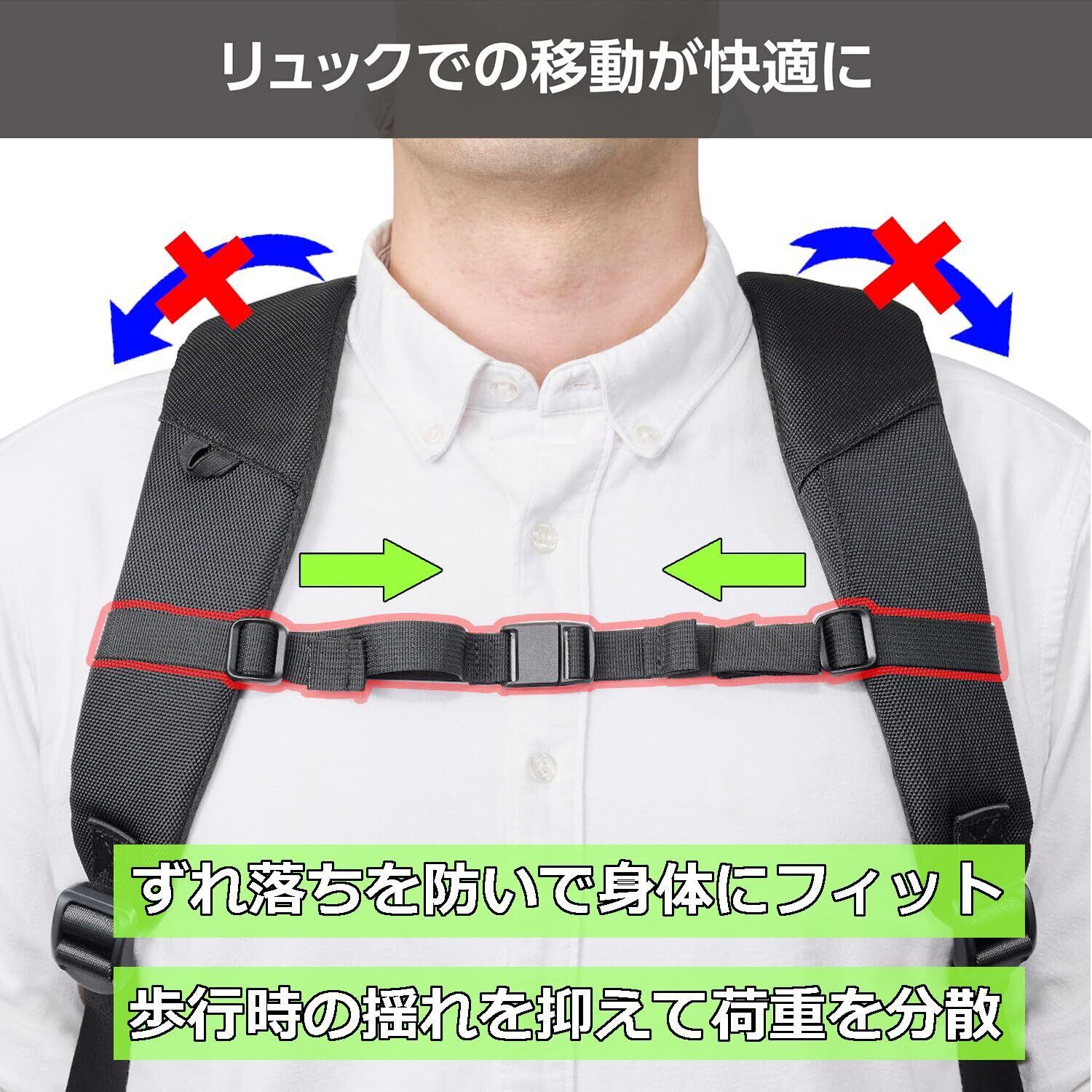 チェストベルトを取り付けることで、リュックベルトが必要以上に広がらなくなり、肩からずれ落ちるのを防いでリュックが身体にしっかりフィットします。