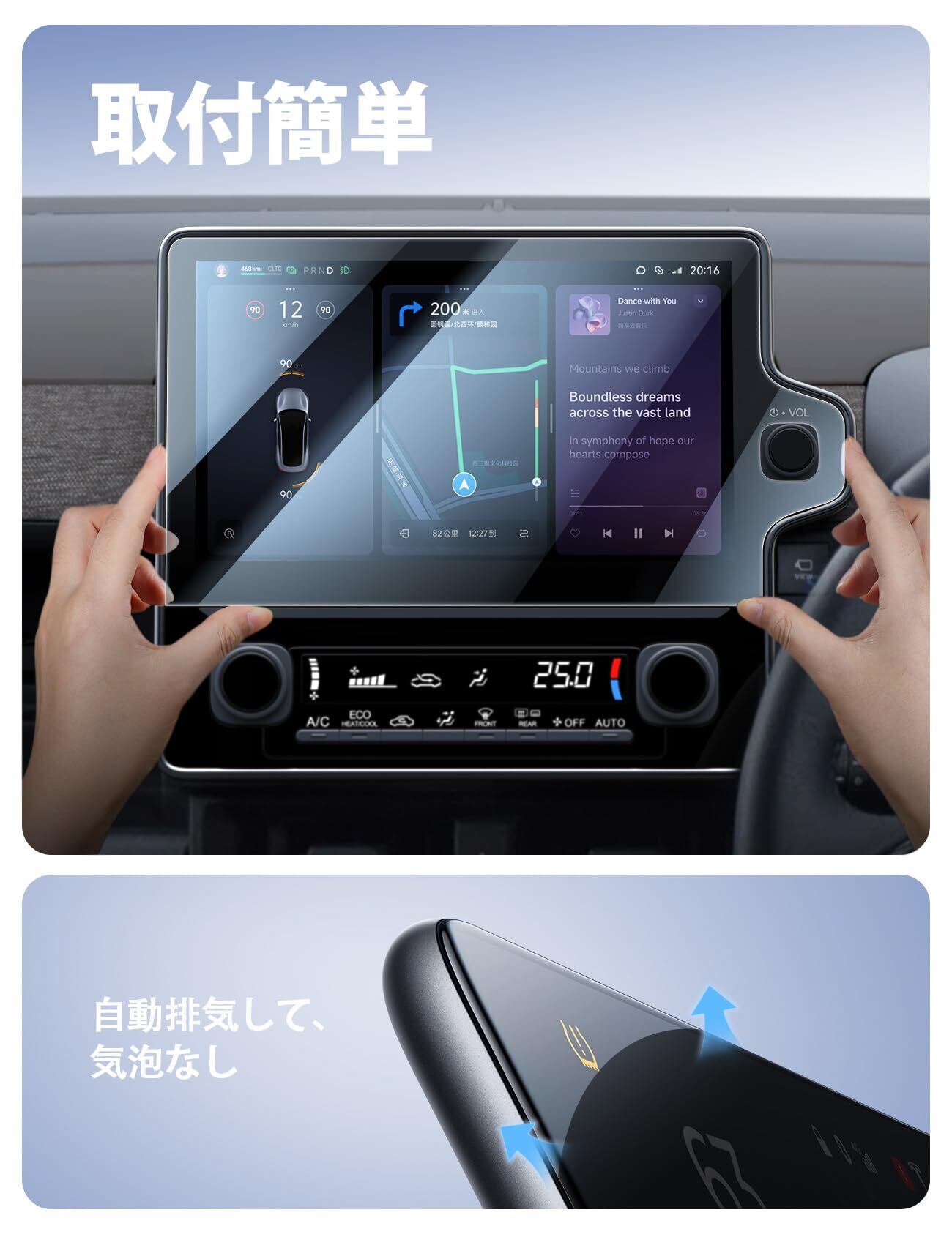 【自己吸着・取り付け易い】本画面プロテクションフィルムは自己吸着技術を採用して、気泡を自動修正して、面倒な貼り直しも不要です。初心者でも簡単に貼り付けます。本ガラスフィルムも強力な粘着力付き、-20℃~80℃の過酷環境でも剥がれない設計です。車内温度変化による剝がれるとひび割れることを防ぎ、ナビ画面保護を徹底します。ご注意:気泡が付かないように、ご使用の前にスクリーンをアルコールシートできれいにしてください。特にほこりや指紋などの汚れを拭き清めてください。