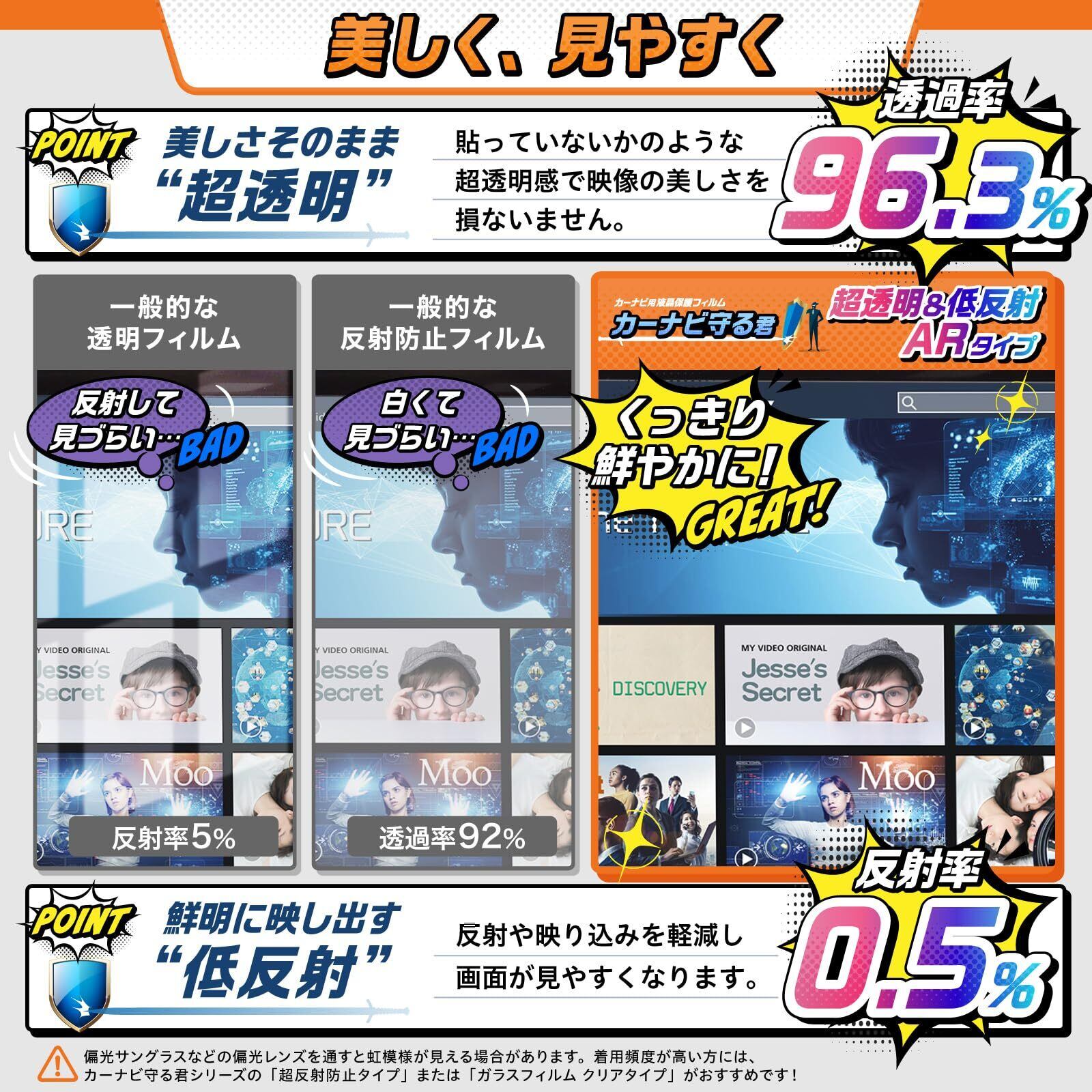 【超透明】:透過率96%の高透過フィルムなので、画面の美しさを損わず、鮮やかな画面のまま映像を楽しめます。 【低反射】反射率1.1%の低反射フィルムなので、反射や映り込みを軽減し、明るい車内でも画面が見やすくなります。 【指紋防止】:フィルム表面の特殊フッ素加工により、指紋が目立ちにくく、付着しても簡単に拭き取れます。