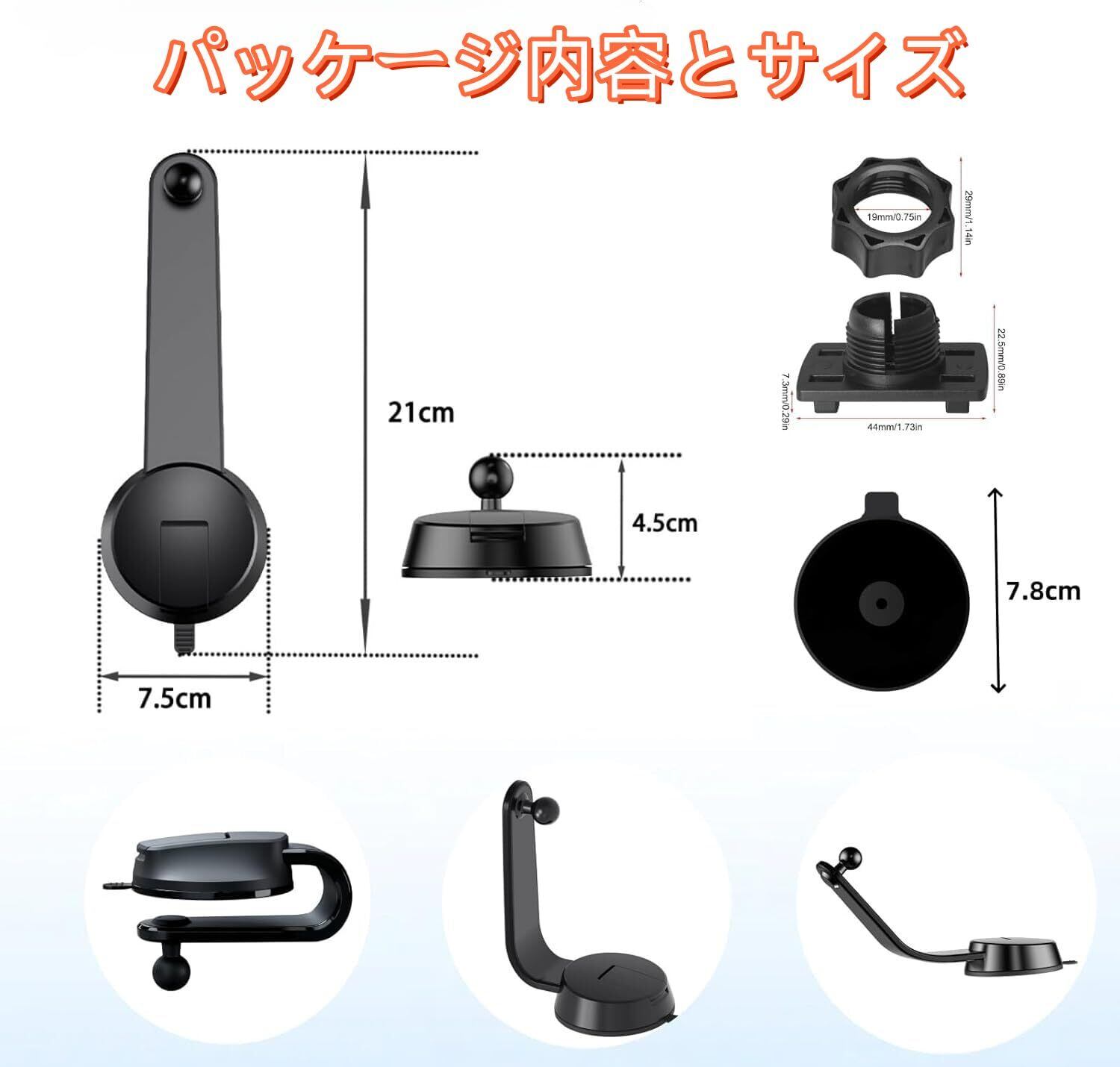 パッケージ内容:吸盤式カーマウント、粘着式ダッシュボードパッド、取り付けガイド。工具不要で、迅速かつ簡単なセットアップに必要なすべてが揃っています。