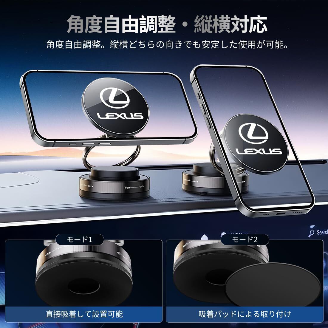 2026最新型レクサス LS/RX/IS/NX/GS/CT~ 全シリーズ対応 車載スマホホルダー 最新マグネット式 スマホスタンド 片手操作 真空吸盤式 360度回転機能 専用ロゴ設計 360度角度調整 カーアクセサリー 高級雰囲気 高強度合金 跡残らず 折りたたみ式 安定性 耐久性 高光沢仕上がり 取り付け簡単