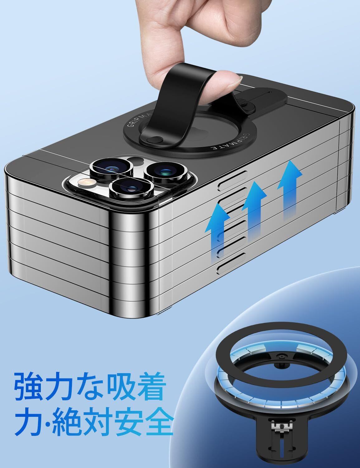 【強力な磁力】はスマホの安全性も重視しています。このスマホグリップは高品質アルミ合金にN52磁石を内蔵。MagSafeアクセサリーに最適化されており、iPhone約6台分の重量を支えられる強力な吸着力で安心して携帯リングを使用する際にスマホが傷つけられる心配がないため、快適にご利用いただけます。