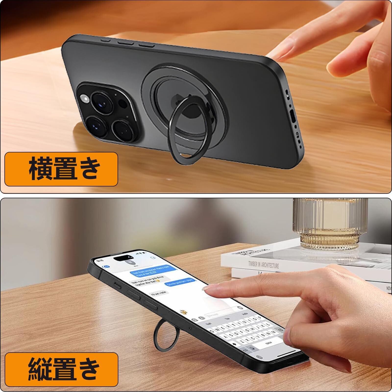 【対応機種】iPhoneシリー iPhone 17、16、16 Pro、16 Pro Max、16 Plus、iPhone 15、15 Plus、15 Pro、15 Pro Max、 iPhone 14、14pro、14pro max、14Plus, iPhone 13、13 Pro、13 Pro Max、 13 mini、 iphone 12、 12 Pro、 12 Pro Max, 12 miniの本体やMagSafe搭載ケースに直接装着可能です。また、Magsafe非対応ケースAndroidなどMagsafe機能のない機種でも、金属リングを貼り付けることで本製品を使用できる。 ご注意ください: 1.ワイヤレス充電の際は、スマホリングホルダーを取り外してください。 2.金属リング(使用している場合)が落ちないように、スマホリングホルダーを横にスライドさせて取り外してください
