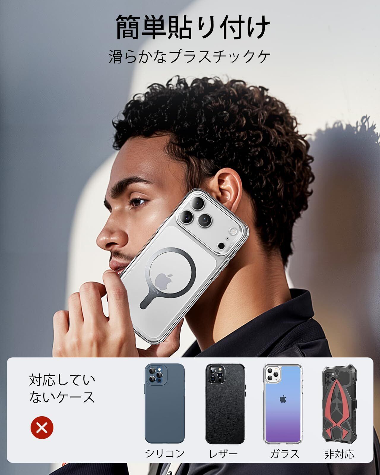 【MagSafeの世界を体験】お使いのケースがMagSafe対応になることで、簡単に急速ワイヤレス充電を体験していただけます。このmagsafe リングは、滑り止めコーティングがされていないPCまたはTPUケース専用です。マグセーフ リングは金属製です。磁石ではありません。