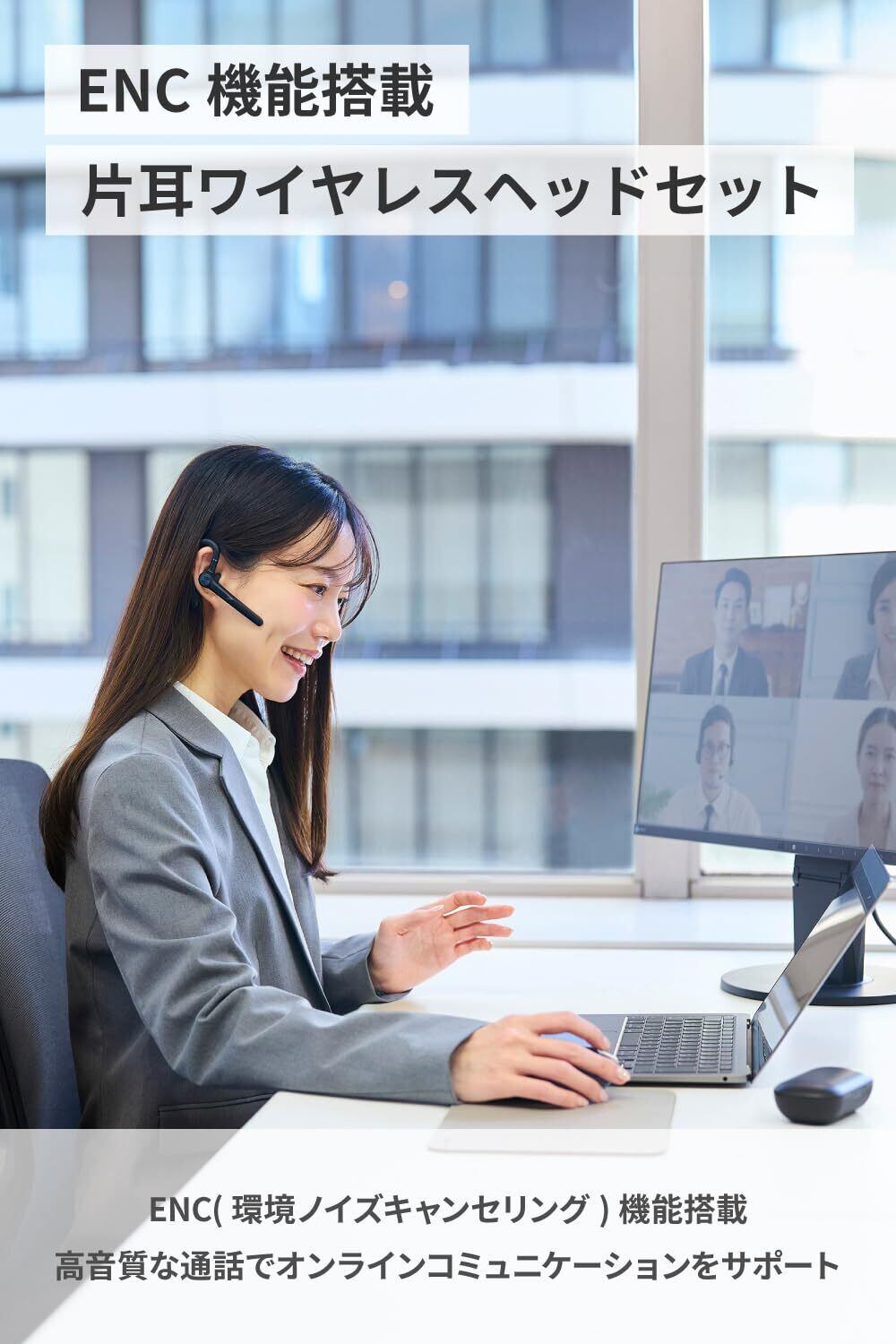 ENC(環境ノイズキャンセリング)機能搭載で周囲の騒音をカットし、ノイズの少ないクリアな会話を届ける片耳ワイヤレスヘッドセットです。高音質な通話でオンラインコミュニケーションをサポートします。