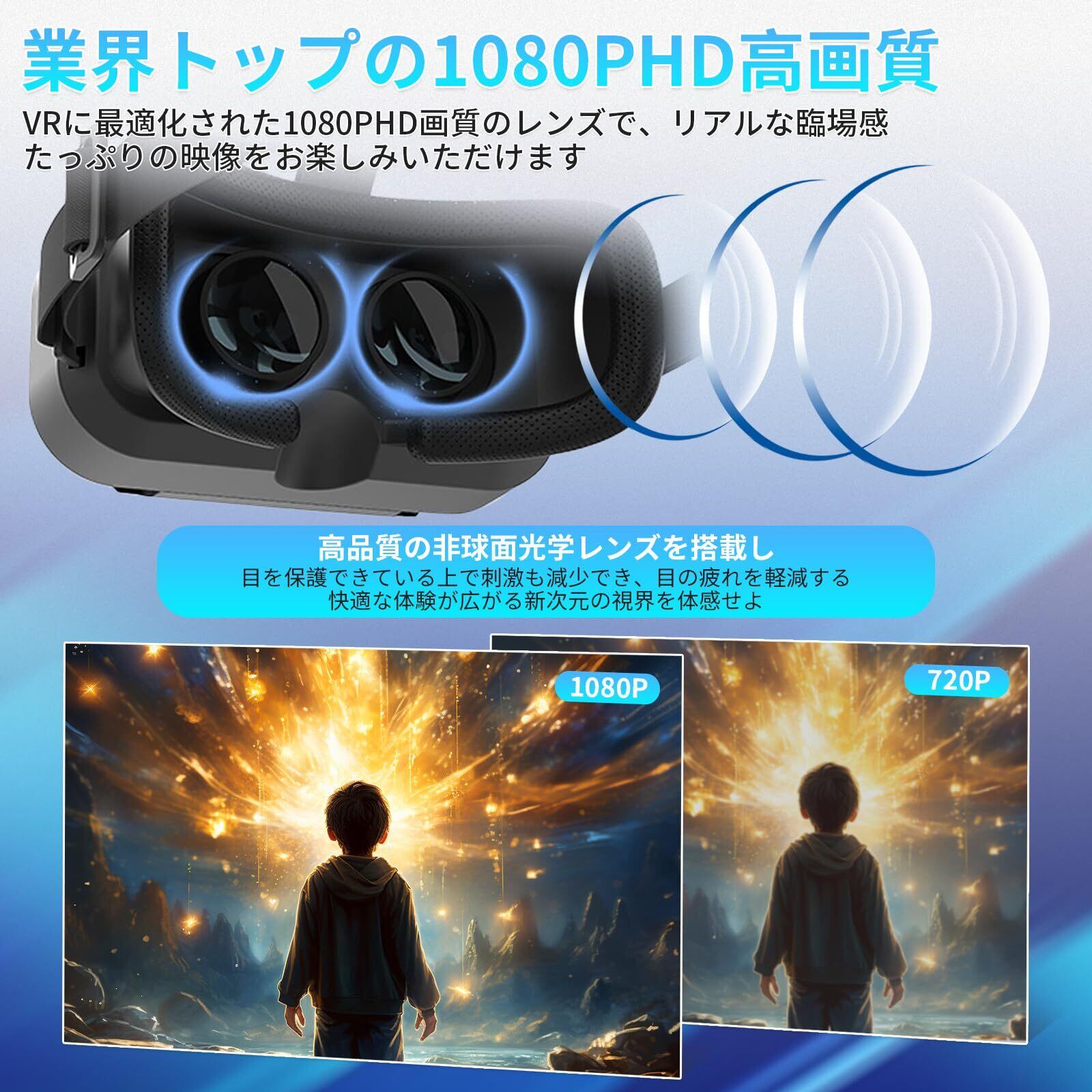【120°超広角&1080P高画質】このVRゴーグルを使用する時、視野角120度広い(視野角の広さは首を動かずに観賞ことができる視界の範囲を指します)、目に映る映像の範囲が広くなり、視角も広くなり、全面的に映像を感じることができます。視野が広く、映像をより鮮明にし。同時に業界トップな1080PHD高画質を感じることができます。臨場感抜群です!