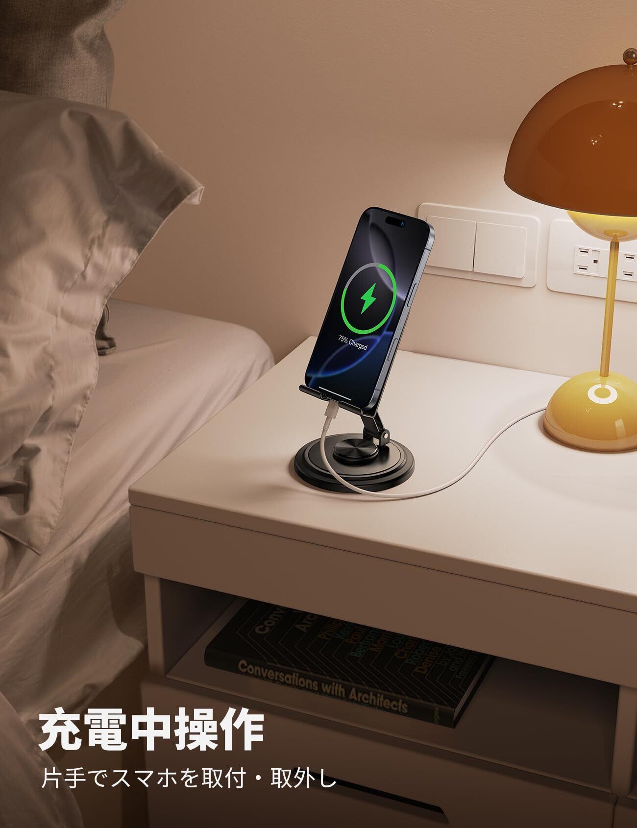 【角度調整・折り畳み・コンパクト】回転軸が二箇所あり、傾斜角度を自由に変えられます。非常に固いヒンジに支えられ、何回か開け閉めしても緩みが生じることは無く、固定されゆるみのようなストレスとは一切無縁。また折り畳み可能なので、カバンに入れて持ち運ぶのにも便利。二つの卵より軽量、大変な重さを感じず外出にも気軽に持って行けます。何処でも楽のスマホライフに役立ちます。新幹線、飛行機移動中、出張、旅行、展示会など様々なシーンに活躍できます。注意:スマホの安定性をするため、80°以下の傾斜で使ってください。