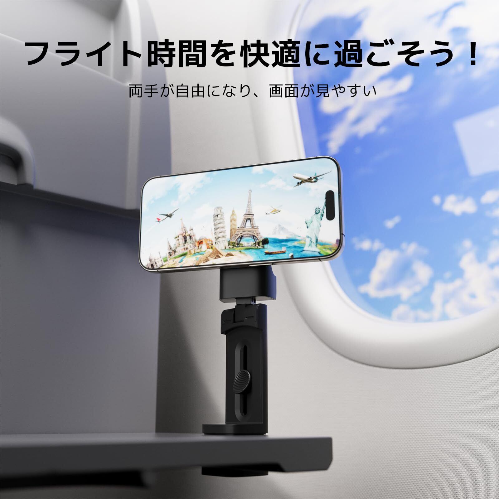 【各場所で大活躍スマホホルダー】卓上、デスク天板の端、飛行機客室の折りたたみ式トレイ、スーツケースのキャリーバー、どこでも設置可能です。オフィス、ベッドサイド、キッチン、ジム、ホテル、車内などの場所で、両手を解放して自撮り、動画視聴、ビデオ通話などを楽しみます。(▲ 一部の航空会社により使用が制限される可能性があります。ご使用前に必ずご確認ください。)