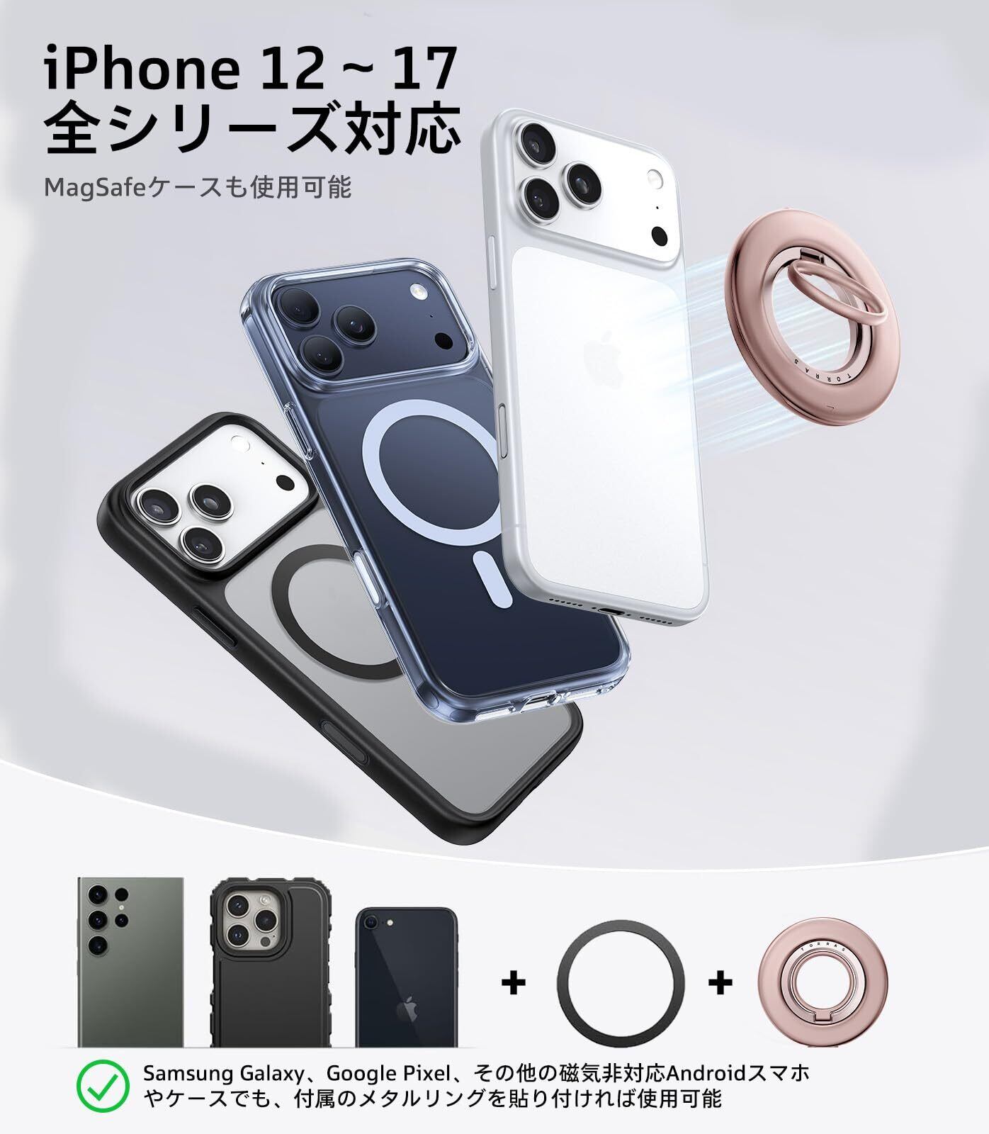 【幅広い機種に対応、付属磁力シートでさらに安心】「Ostand Dual Ring」は、For iPhone 17/16/15/14/13/12シリーズのMagSafe対応機種やケースにそのまま装着OK。For Google Pixel 9a / Samsung Galaxy S25 Ultra…MagSafe非対応のスマホやケースでも、付属の磁力シートを貼ればすぐに使えます。どのスマホでもしっかり固定できて、操作中も安心です。【】お問い合わせ方法:「注文履歴」→「注文に関する問題」→「出品者に問い合わせる」→「送信」 や 商品ページ→「販売者TORRAS Life」→「質問する」