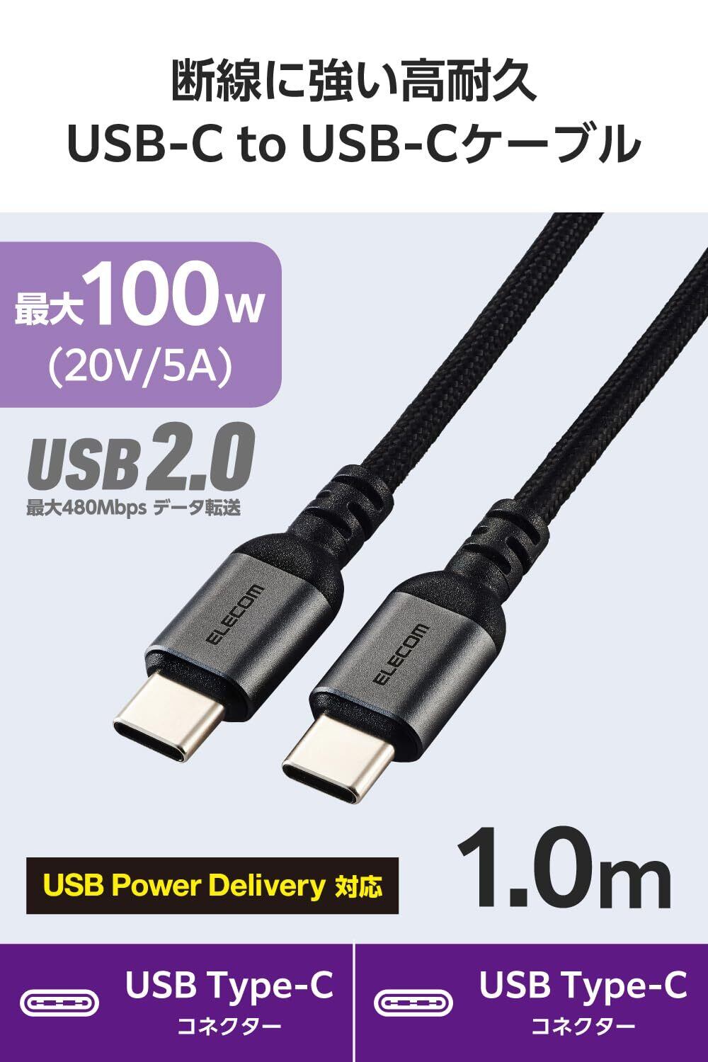 エレコム USB Type C ケーブル 1m 100W PD対応 高速充電 断線防止 高耐久 ナイロンメッシュ ブラック MPA-CCECAN10BK