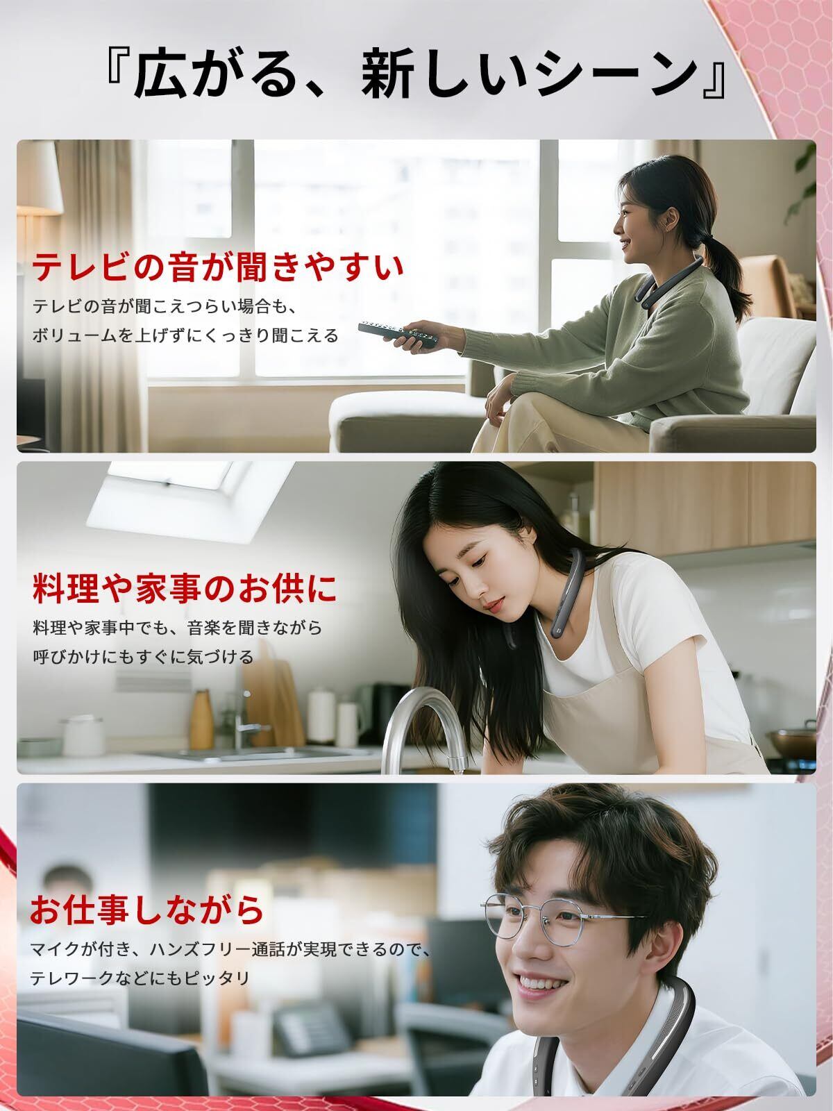【まるで空気のように軽やか! たったの88g、驚異の装着感】「重い」「首が疲れる」は、もう過去の話。業界トップクラスの軽さ88gを実現しました。まるで無重力のように肩にのせれば、その軽さに驚くはず。一日中つけていても、その存在さえ忘れてしまうほど。首や肩への負担を最小限に抑え、あなたの動きを妨げません。【耳を塞がないから、快適で安全! "ながら聴き"の最適解】イヤホンやヘッドセットのような耳への圧迫感・蒸れ・かゆみは一切ナシ!開放型設計だから、周囲の音や大切な呼び声もクリアに聴こえます。家事をしながら、育児をしながら、ジョギングをしながら…。音楽を楽しみつつ、生活やコミュニケーションもスムーズに。Bluetooth接続で最大10mの自由な動きとIPX5防水で、キッチンでも運動中でも、思いのままに。