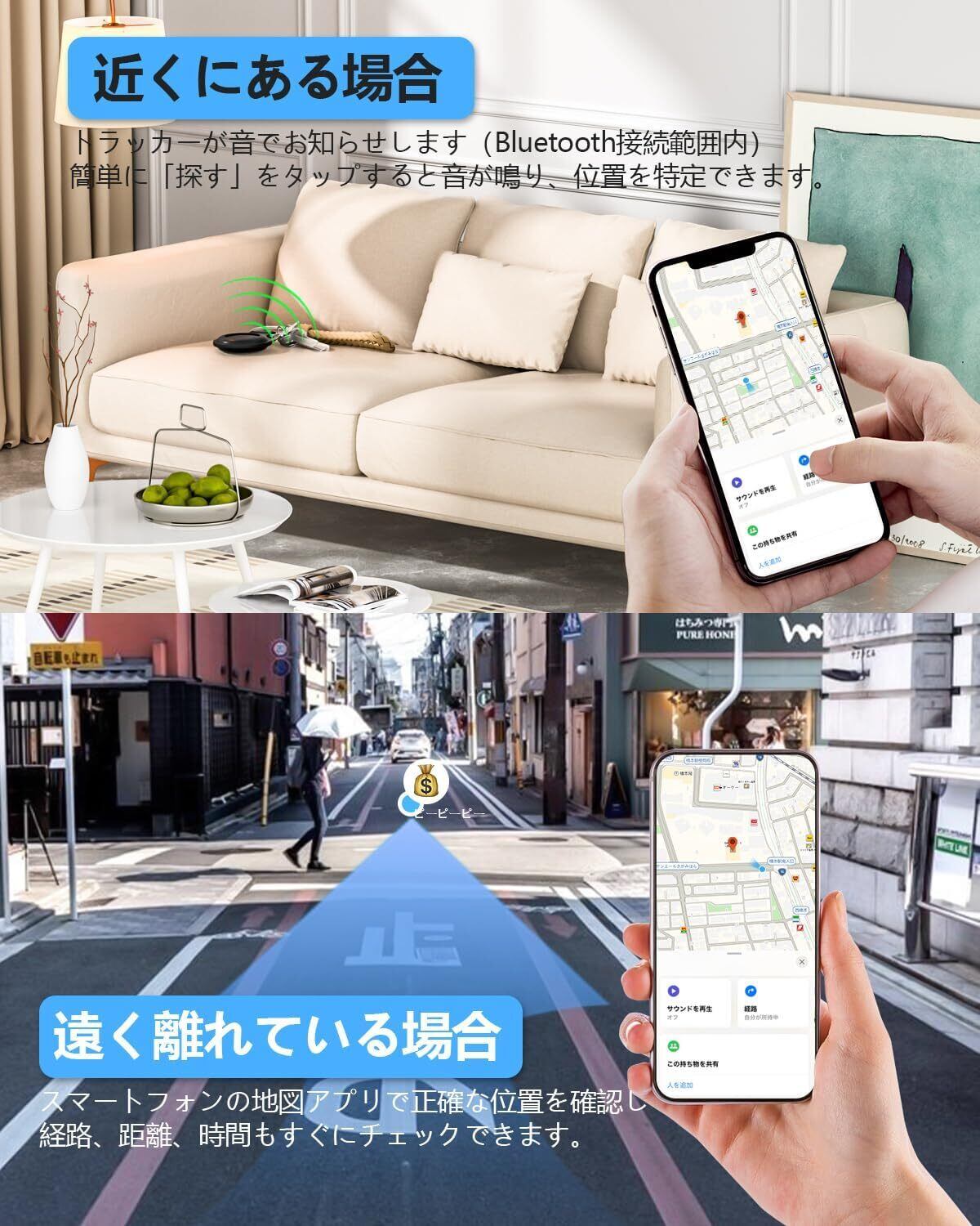 ⑤【IOSグローバル連携機能】 もしトラッカーをうっかり失くしてしまった場合、iOSスマートトラッカーを使えば、世界中で追跡できます。他のIOSデバイスが接続すると、「探す」アプリが自動で位置情報を更新。所有者は接続した人の位置を把握でき、紛失物の回収が可能になります。