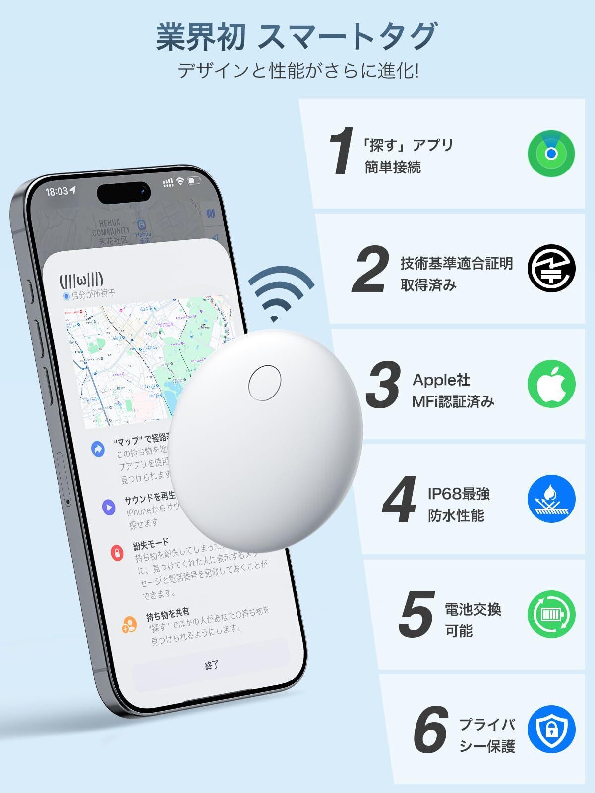 【防水性・防塵性】:位置情報タグは「IP68」という高防水性を持っていて、雨の日や砂日の悪条件でも安心して使えます。砂や埃が付いたらやさしく水洗いすることもできるので、いつもキレイでピカピカな状態に保ちます。MFi認証済みの正規商品で、ご安心使用いただけます