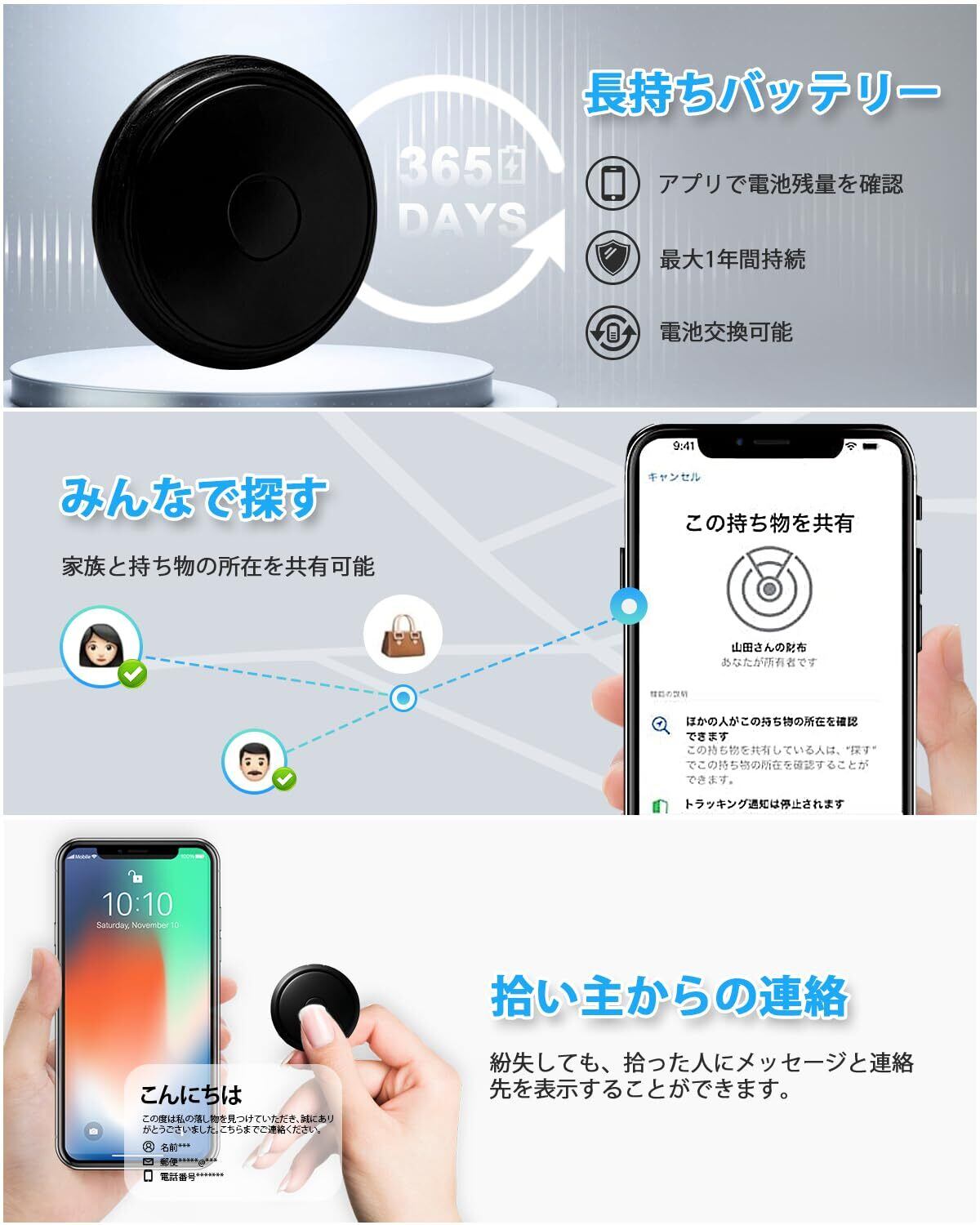 【多用途・鍵・財布・ペット・子供見守りまで】 鍵紛失防止、財布・カバンの置き忘れ対策に最適。自転車・車の盗難防止にも役立ちます。 子供の迷子防止、高齢者見守り、ペット(犬・猫)の脱走防止など、大切な人と物を24時間見守り。