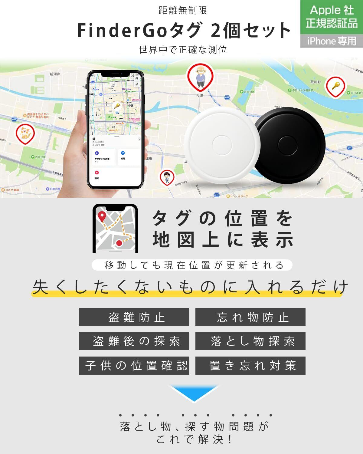 【Apple「探す」アプリ完全対応・追加アプリ不要で月額0円】 MFi認証 スマートタグ として、iPhoneの純正アプリ「探す」に直接接続。別途アプリ不要で、設定が簡単。 世界規模のFind Myネットワークを利用し、日本国内はもちろん海外でも位置を特定可能。一切の月額料金がかからず、追加費用ゼロでグローバルトラッキングが実現。