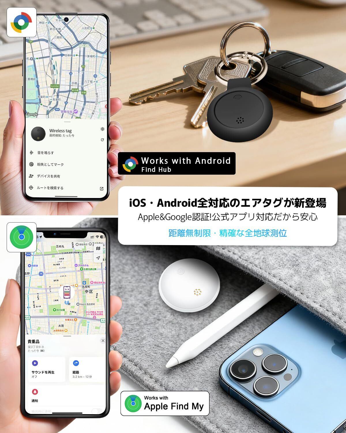 【Apple&Google 認定製品!公式アプリ対応で安心・簡単】従来のiOS、Android airtagは非公式アプリのダウンロードが必要で、使いにくく個人情報の扱いに不安がありました。本製品は純正アプリiPhone「探す」、Android「GoogleのFind Hub」に完全対応し、スムーズな接続と高精度位置追跡を実現。アンドロイドでもapple エアタグ並みの使用感!月額料金は一切不要で、日本国内外を問わず追跡可能です。