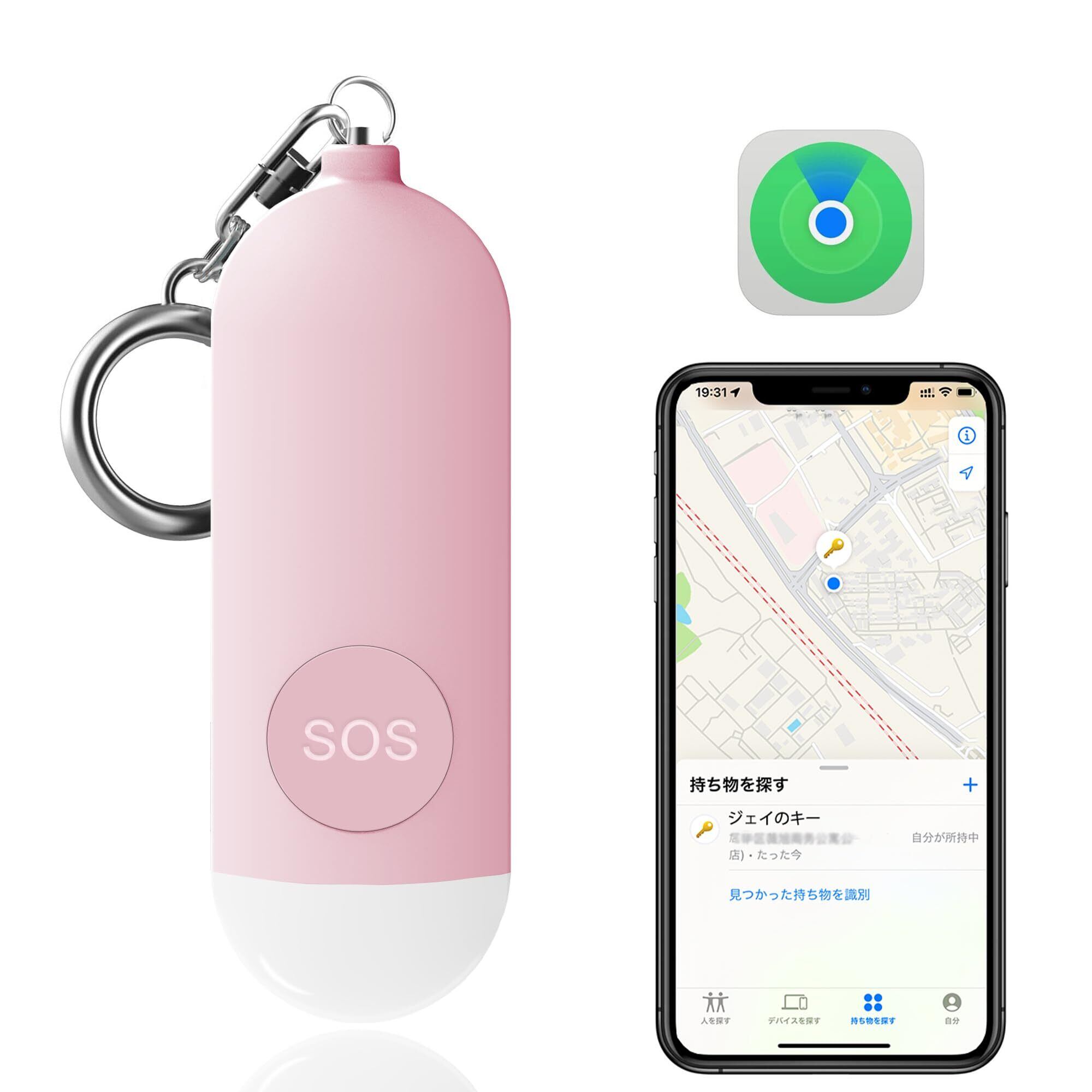 紛失防止タグ子供GPS小型追跡タグ 忘れ物防止 防犯ブザー 130dB大音量防犯ベル機能を搭載しているスマートタグ Appleのに対応 (iOS端末のみ) LEDライト付き キーファインダー 防犯グッズ 大人/小学生/女の子/男の子/迷子/高齢者/犬/猫/スマホ/キー/財布 Type-Cケーブル/日本語説明書付き(ピンク)