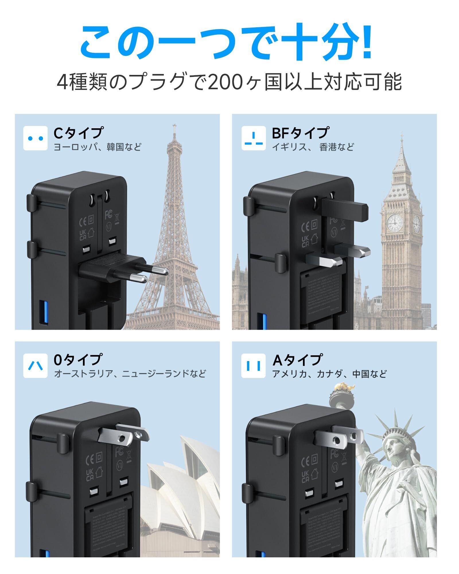 【全世界200カ国対応|自動認識でワンタッチ展開】日本(A型)を含む4方式のプラグを内蔵し、欧州・英国・オーストラリア・中国など主要ビジネス・観光地を完全カバー。複雑な付け替え不要で、行先に合わせてワンタッチで展開できるため、初めての渡航先でも迷いません。