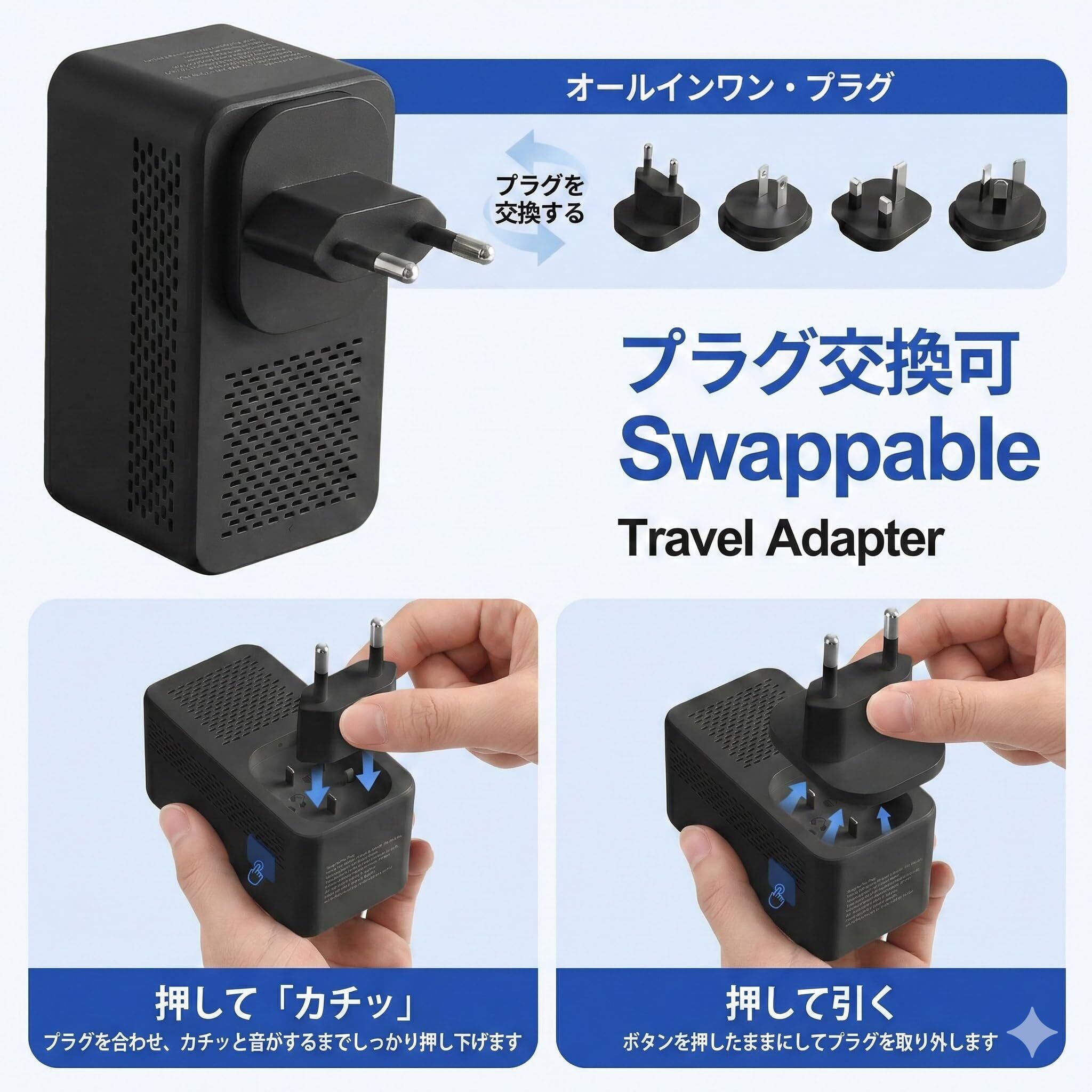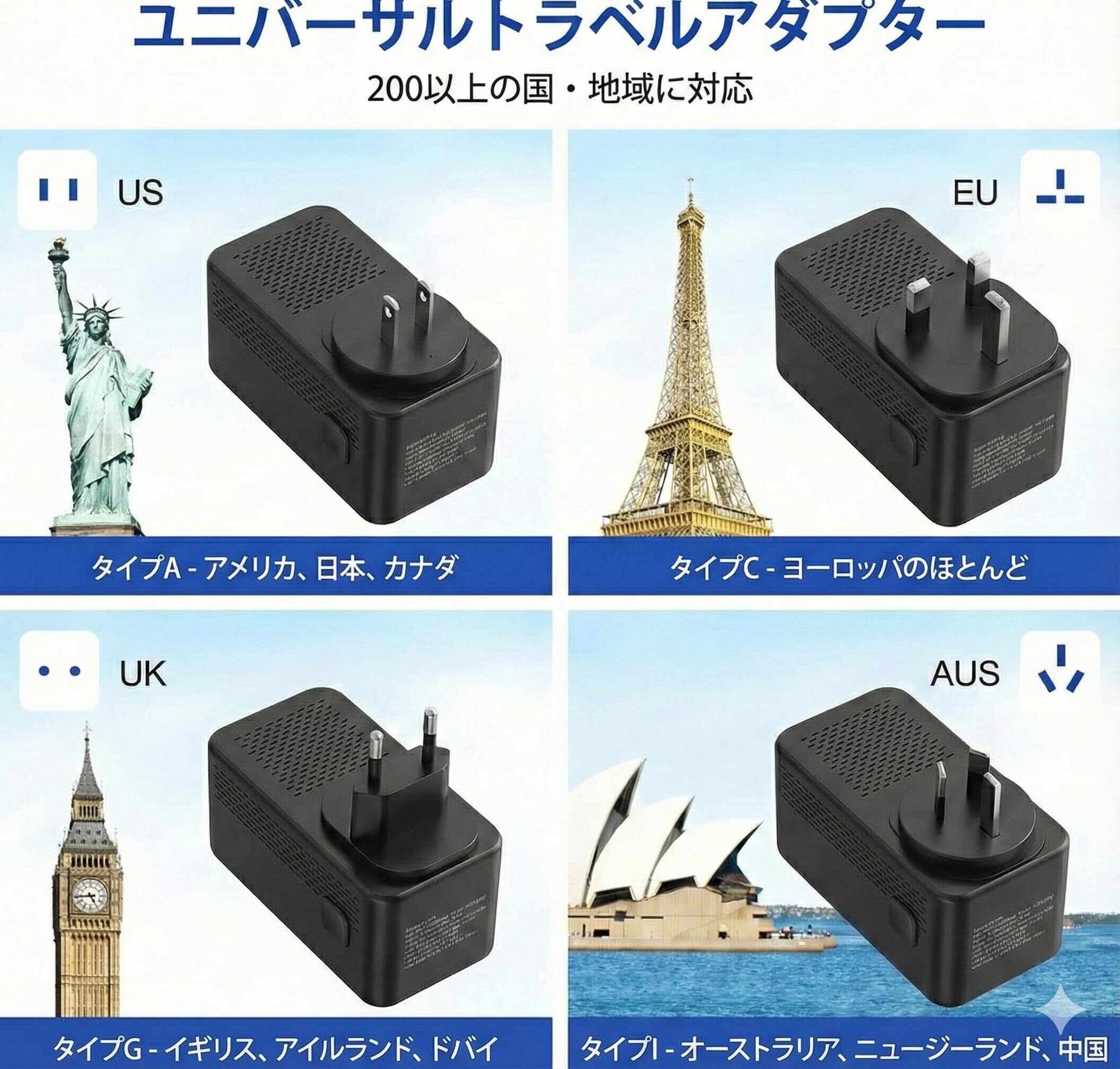 【世界150ヶ国以上に対応・変換プラグ付】 交換可能な4種類の国際プラグ(Type A/C/G/I)が付属しており、アメリカ(Type A)、ドイツ・フランス・ヨーロッパ全域(Type C)、イギリス・香港(Type G)、オーストラリア・中国(Type I)など、世界中の主要国で使用可能です。整理しやすい専用のトラベルポーチも付属しており、海外旅行や出張に最適です。