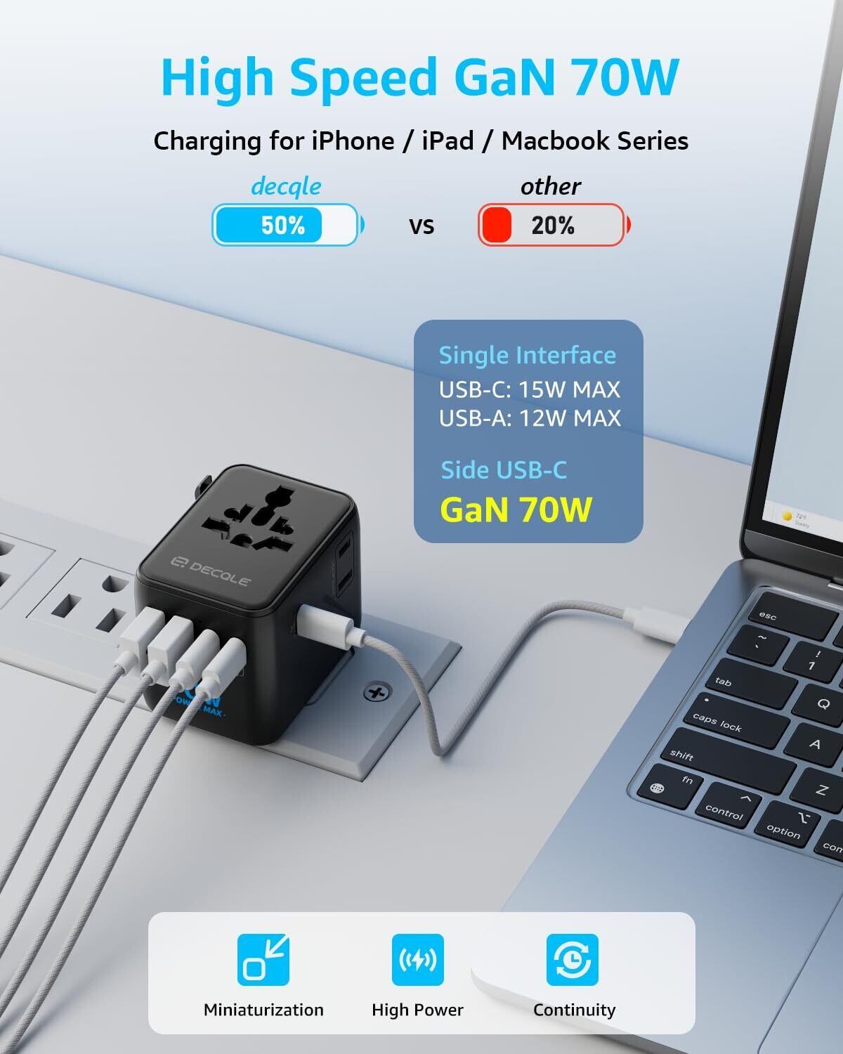[一台7役、USB-C×3&USB-A×2&追加ACコンセント] 70Wの最大出力はスマホやスマートワッチなどのデバイスに充電ができます。本製品はUSB-Cポートを3個、USB-Aポートを2個と側面にもう1つのACコンセントを内蔵しており、およびACコンセントは最大7台までのデバイスを同時充電が可能です。また、変換プラグに内蔵しているスマートチップは、複数のデバイスを同時に充電する際に、自動的に電力を分配し、夜間に充電する場合にもデバイスを保護しています。
