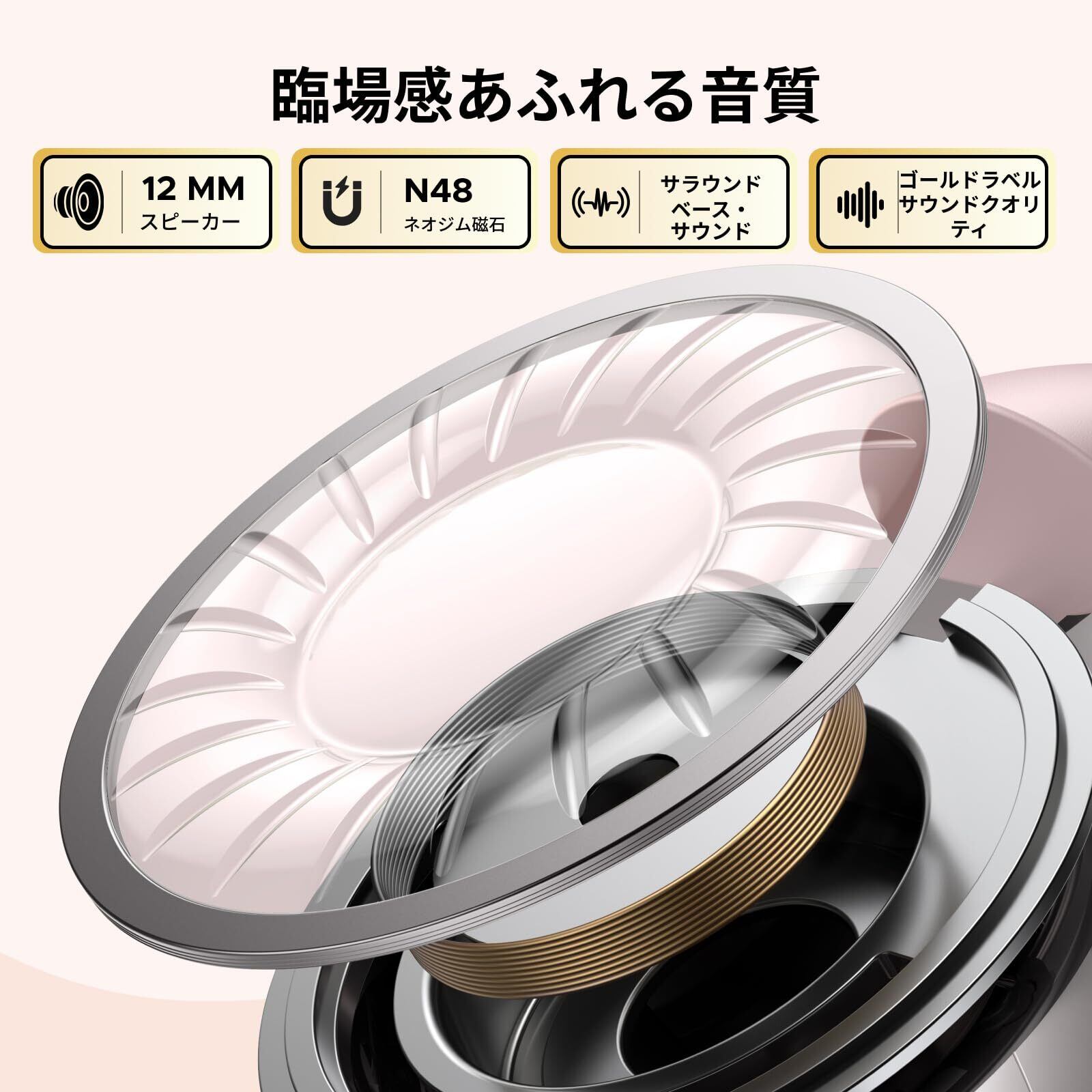 【音の妥協ゼロ・Hi-Fi超高音質】12mmドライバーとコンポジット振動板を搭載。繊細でパワフルな音質を実現し、特に高音と低音の再現性に優れています。シングルマグネットよりも振動板の制御力が強く、音の歪みを最小限に抑え、より自然で臨場感ある音場を提供します。