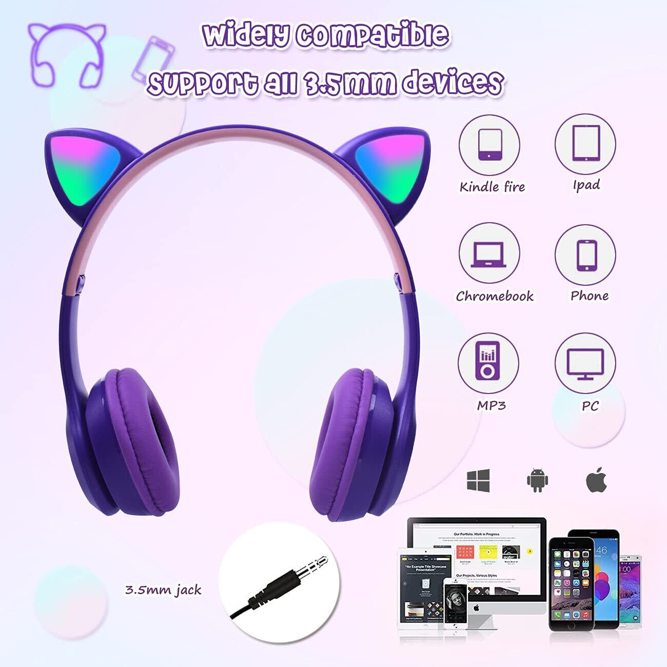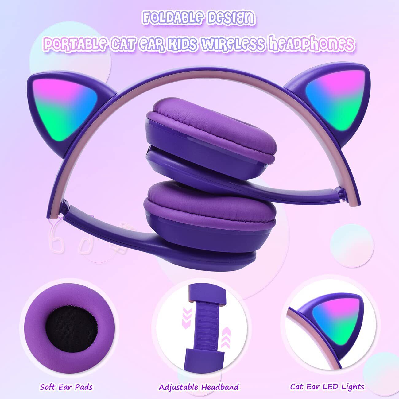 子供用ヘッドホン Megadream無線/有線ヘッドホン 85 dB安全音量制限 マイク付き 猫耳LEDライトデザイン Bluetooth5.0 TFカード挿入可能 サイズ調節可能 学校/タブレット/旅行/ MP3
