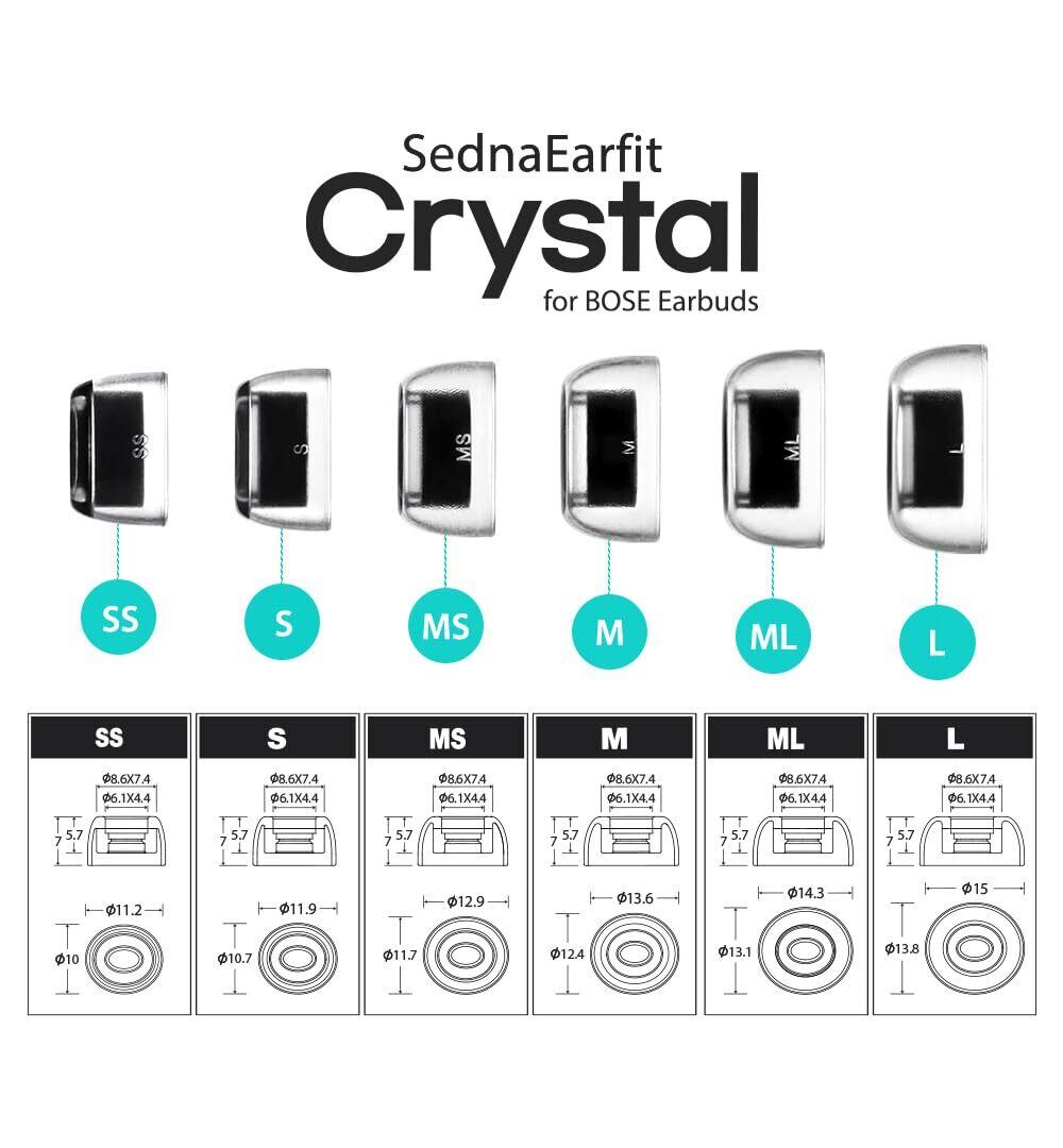 【選びやすい6サイズ展開とセットパッケージ】サイズ展開はSS/S/MS/M/ML/Lの計6サイズ展開。単品サイズ2ペアと、3サイズを1ペアずつパッケージングした3ペア構成、ALLサイズ入りパッケージの3種類を採用。ステージ空間あふれるサウンドと美しく輝くスタイルを持つこのSednaEarfit Crystalは、BOSE製TWSの持つポテンシャルを最大限引き出しつつ、イヤホンの長時間装着や落下などの問題に対しAZLAならではのアプローチで解決します。