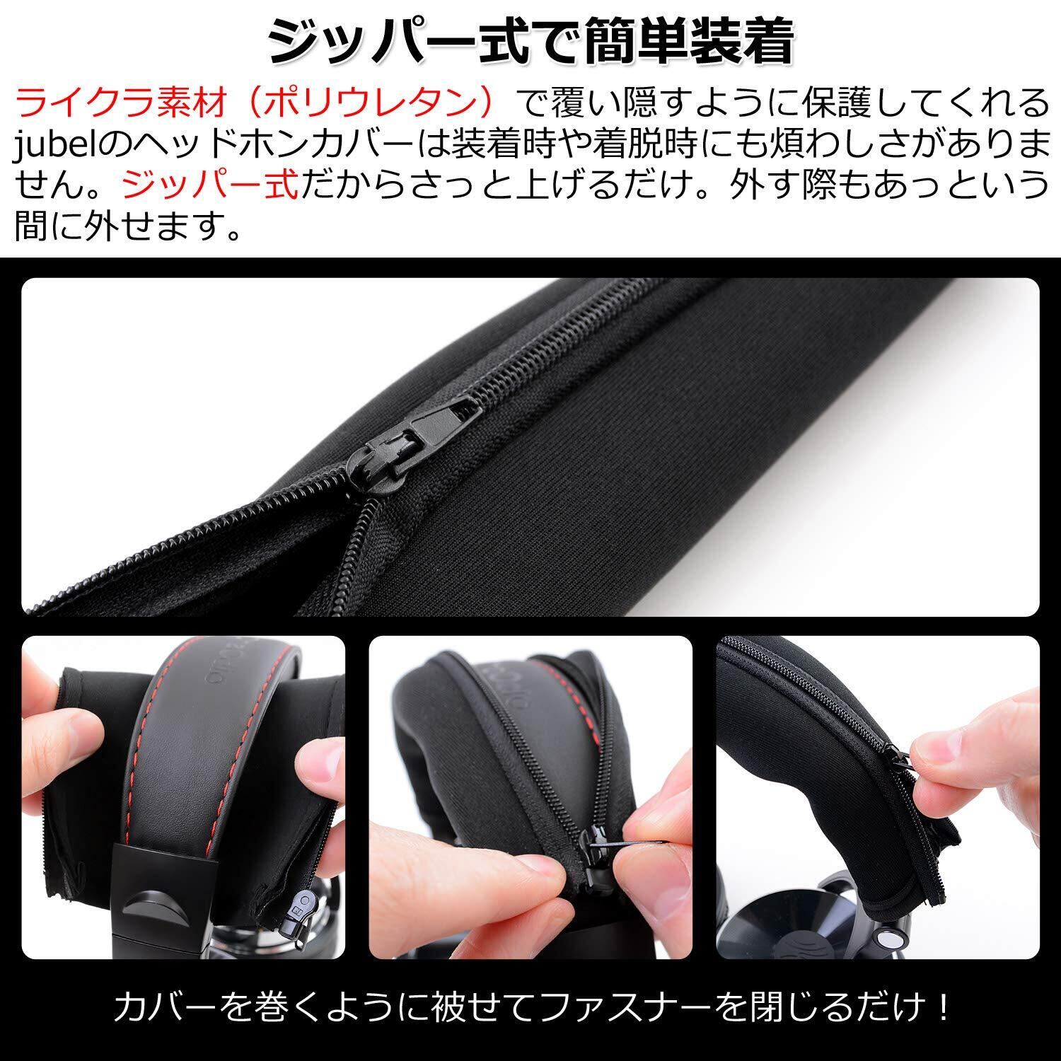 4【ジッパー式で簡単装着】『ライクラ素材』(ポリウレタン)で覆い隠すように保護してくれるこのヘッドホンカバーは装着時や着脱時にも煩わしさがありません。『ジッパー式』だからさっと上げるだけ。着脱時にもあっという間に外せます。ヘッドホンカバーが汗や整髪料などで汚れてしまった場合には、もちろん手軽にクリーニングしていただけます。ライクラ素材だからこそのメリットもございます。①手軽にクリーニングできる②汗や熱を逃がしムレを軽減③ある程度の衝撃や細かな傷から守ってくれる④優れた伸縮性で幅広い製品に対応 【商品仕様】●『仕様』ヘッドホンカバー2個セットor1個 ●『サイズ』最小:5.5*21㎝ 最大:11.5*21㎝ ●『カラー』ブラック ●『重量』1個/10g ●『材質』防水ライクラ素材(ポリウレタン) ●『期間』購入日から30日間の返金(※【jubel】正規取扱店からの購入に限り)