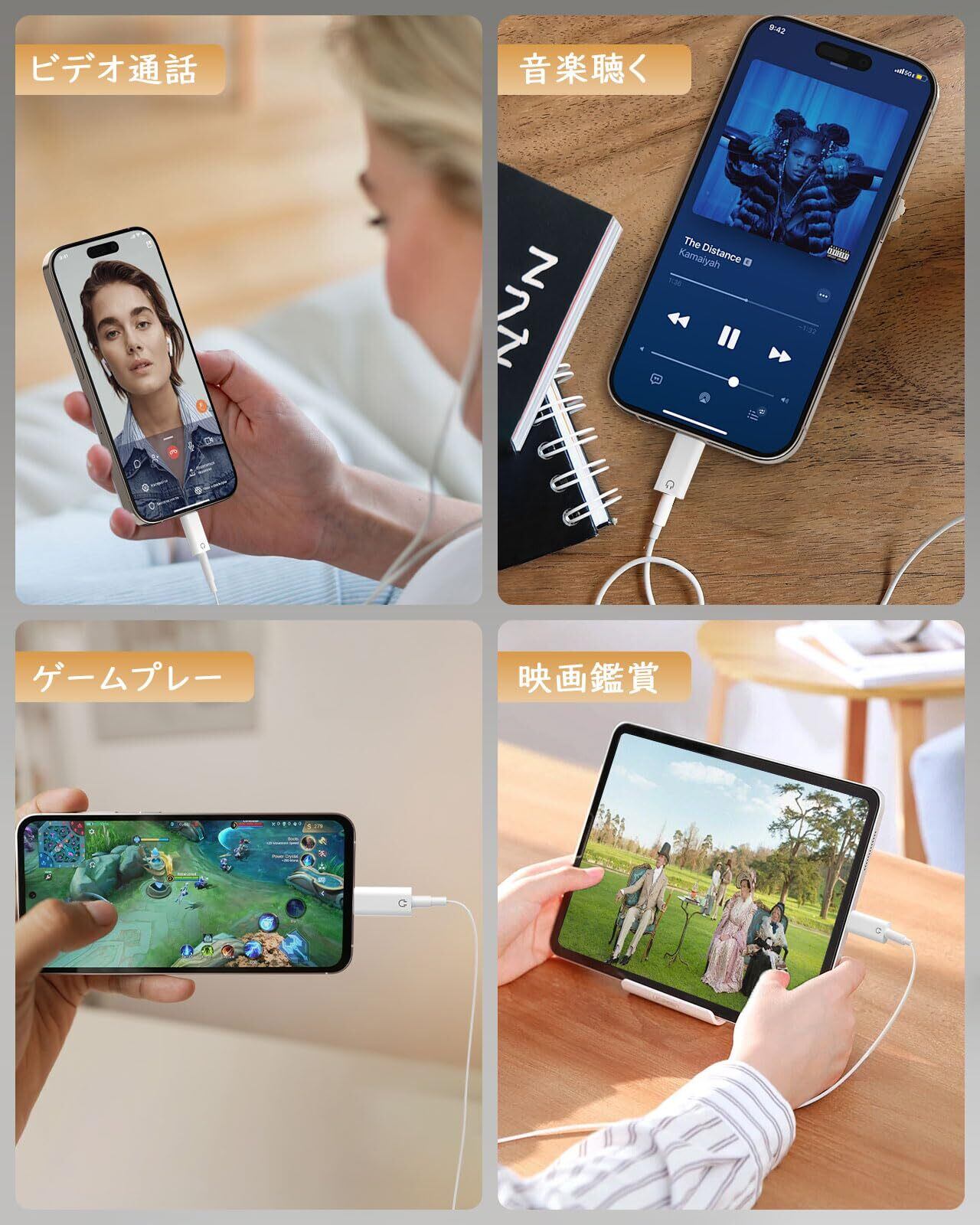「USB-C搭載端末幅広く対応」本アダプターは、iPhone17e/Air/17/17Pro/16/16e/15シリーズ/iPad Pro/Air/Galaxy SシリーズなどUSB-C端子を搭載した多くのスマートフォン/タブレット/ノートPCに対応可能です。音楽再生、通話や動画視聴など多様なシーンで活用できます。※ご注意:Type-Cと3.5mmイヤホンジャックを併設する端末、Type-Cポートがオーディオ出力非対応の端末ではご利用いただけません。