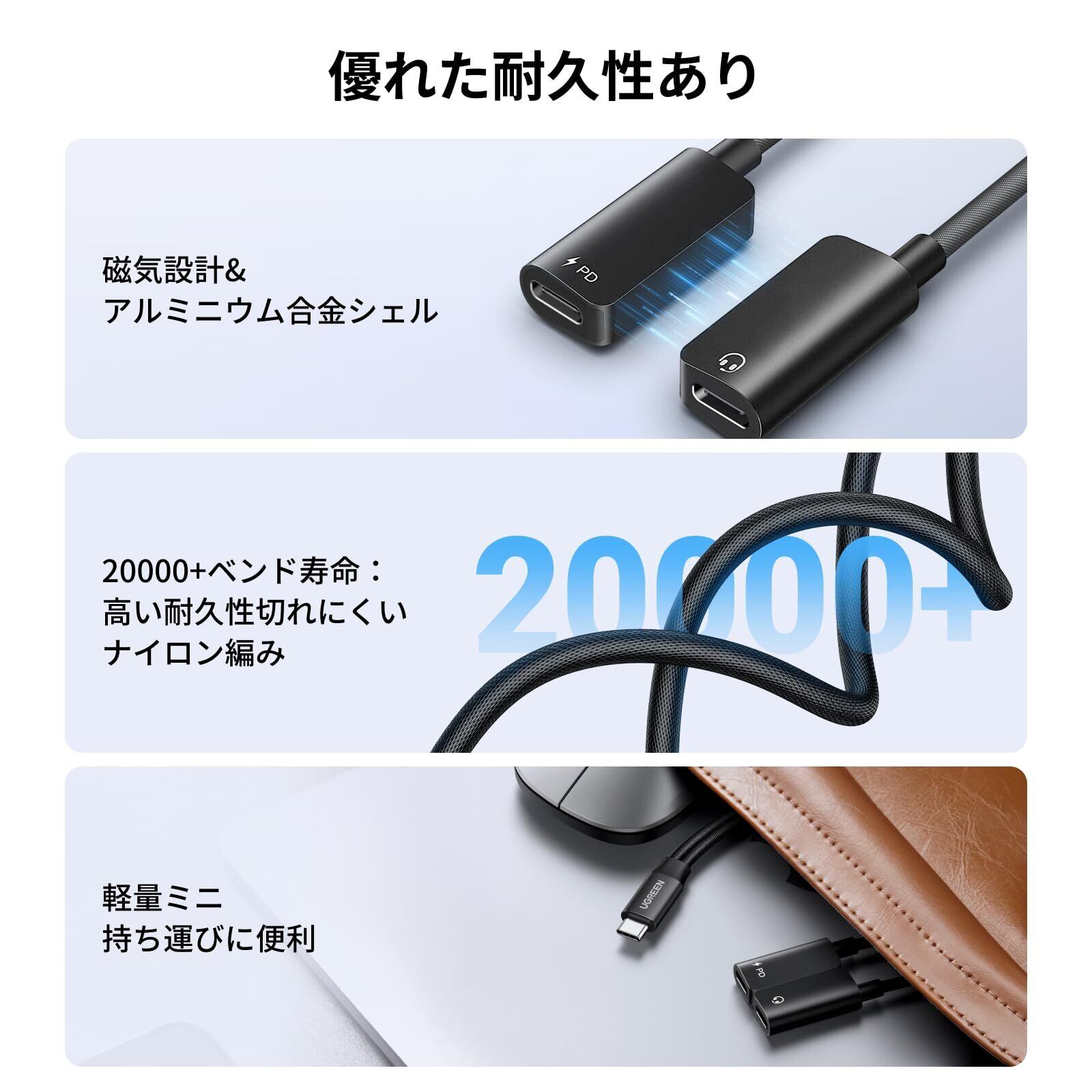 超耐久性を実現する磁気設計:磁気USB C -Type C ヘッドフォンおよび充電アダプターにより、ケーブル接続がより強固になり、ケーブルの断裂を心配する必要がありません。 編組ナイロンケーブルにより耐久性が向上し、張力が軽減され、プラグの抜き差しが簡単になります。 優れた放熱性を実現するプレミアムアルミニウム合金ケース。 高品質のコネクタにより、安全な高速データ伝送がされます。 持ち運びに便利なサイズで、旅行、自宅、オフィスに最適です。