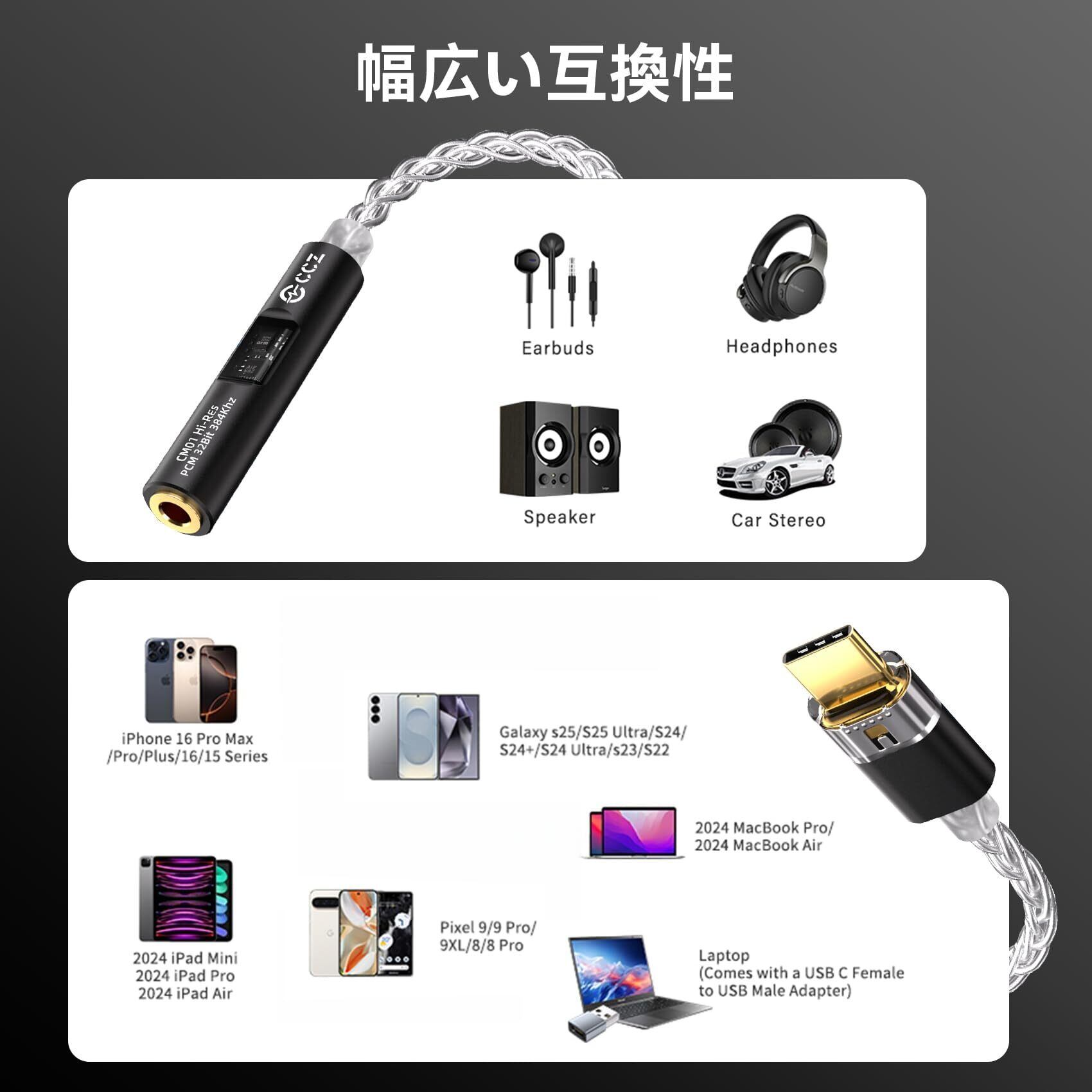CCZ CM01 イヤホンジャック 変換 タイプc usb dac タイプc イヤホン 変換 Type-C DAC ケーブル CX31993+MAX97220 ハイレゾ デュアルチップ 32Bit/384kHz 8芯4N 高純度単結晶銅銀めっきケーブル イヤホンアダプター ポータブルアンプ(ブラック)