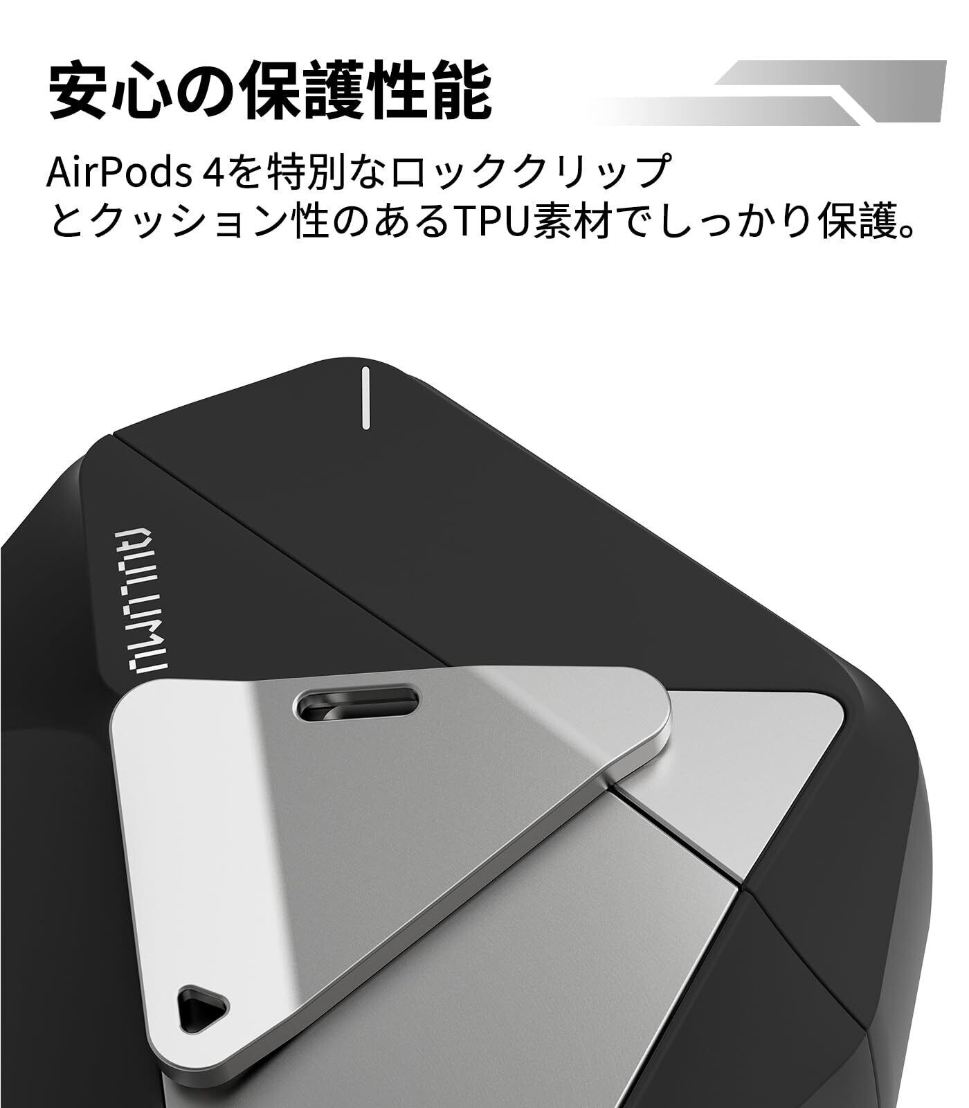 Aulumu A29 AirPods 4 用 ケース エアポッズ 第4世代 ケース (2024) ジオメトリックデザイン 亜鉛合金ロック 落下防止 ワイヤレス充電 ストラップ付き 耐衝撃 強化コーナー保護 ブラック
