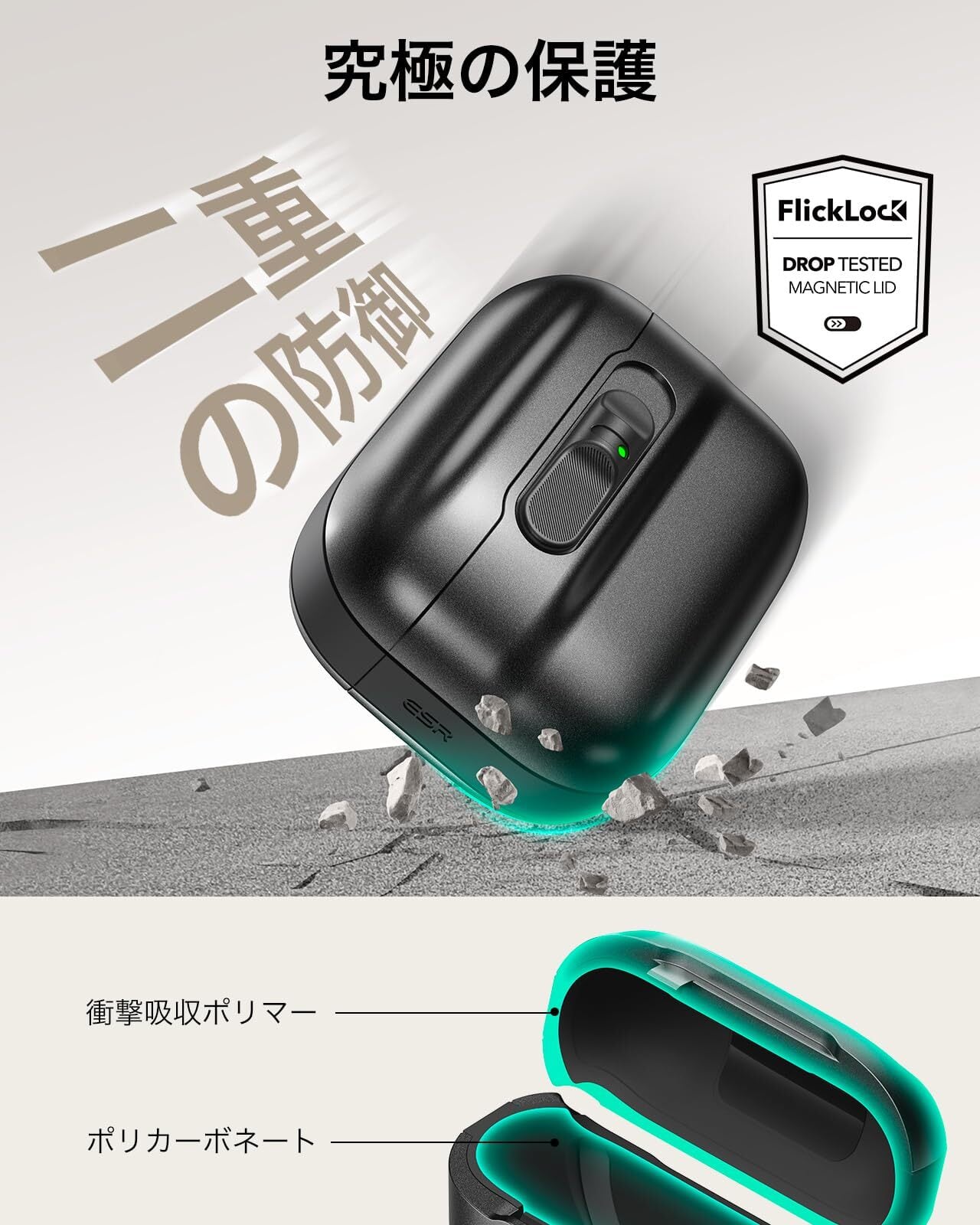 【耐衝撃フリックロックリッド】カバー上下に配置された強力な磁石(750gの保持力)と内蔵ラッチがAirPodsをしっかり固定し、高硬度シェルと柔軟な衝撃吸収コアの二重構造で、充電ケースを徹底保護します。